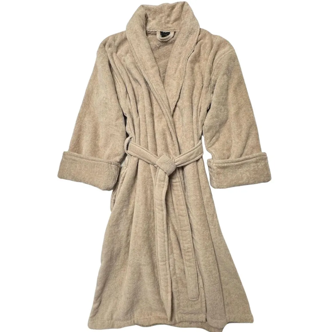 Myk og lun badekåpe i beige frotté, perfekt for rolige morgener eller etter en dusj. Med praktiske lommer og belte i livet gir den både komfort og funksjon.