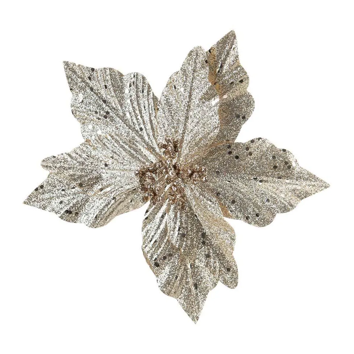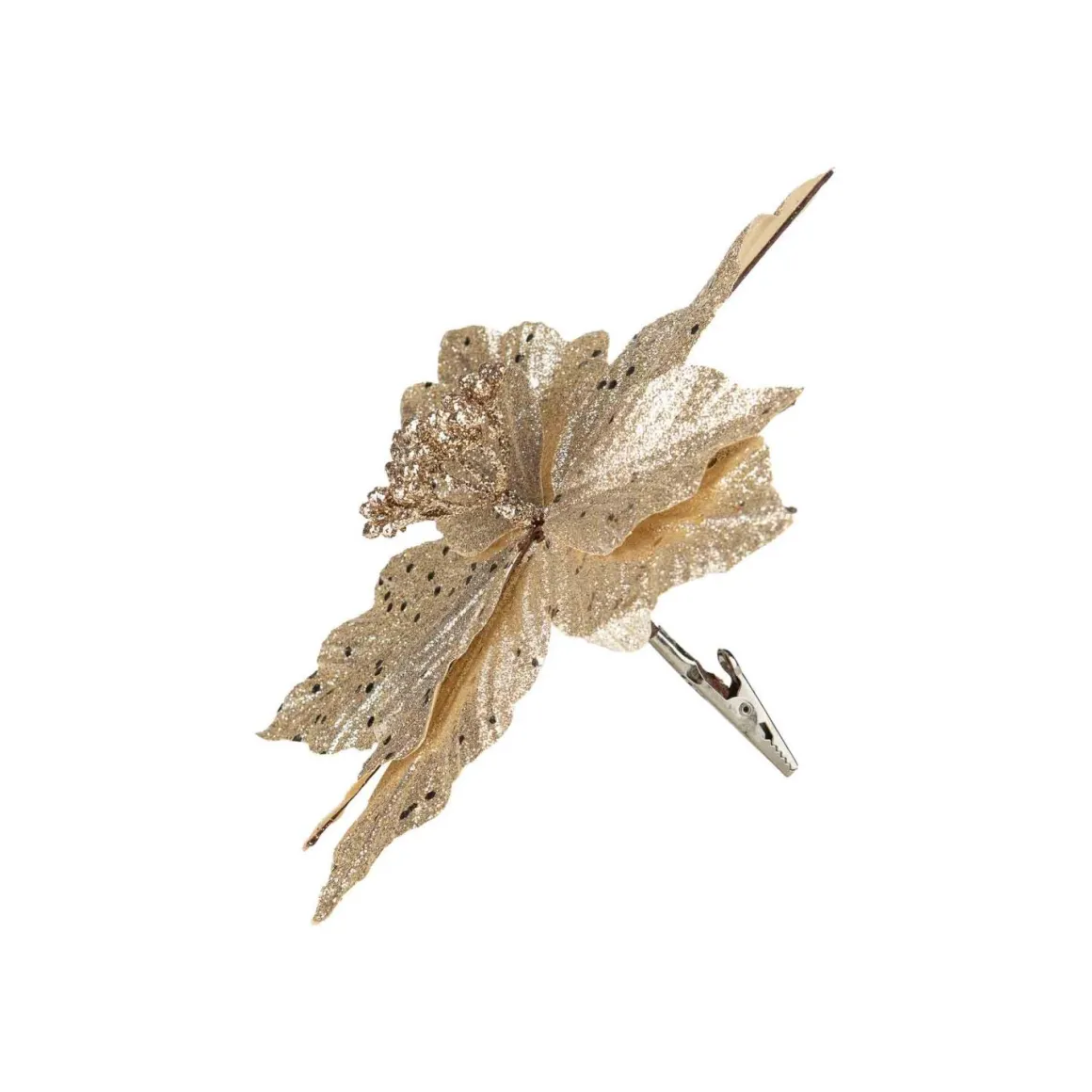 Legg til en touch av eleganse i ditt juletre med vår vakre blomst på klype i gull. Denne delikate juletredekoren kombinerer luksuriøs gullfarge med en naturlig blomsterdesign.