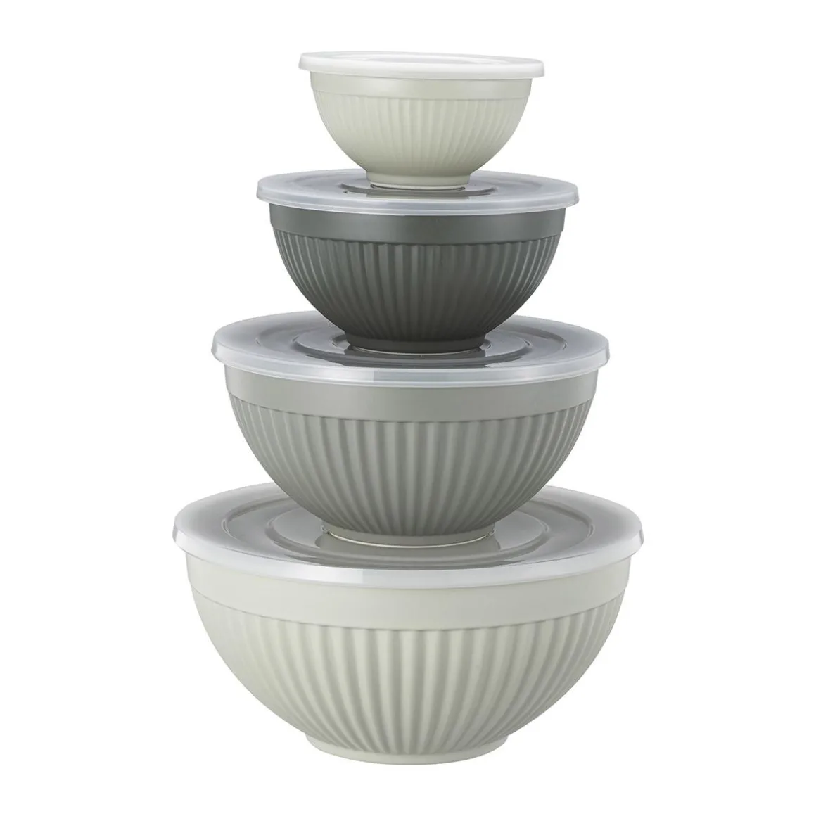 Dette praktiske bollesettet i melamin er perfekt til både matlaging, servering og oppbevaring. Settet består av fire boller i ulike størrelser, alle med tilhørende lokk. Bollene har en dekorativ rillet overflate og nøytrale farger som passer fint inn på kjøkkenet. De er lette, solide og enkle å rengjøre – ideelle til baking, salater eller rester. Et funksjonelt sett som gjør hverdagen på kjøkkenet litt enklere