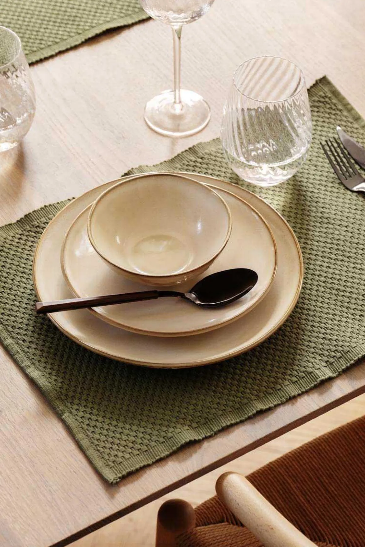 Dekkebrikke i kraftig bomull med strukturert vev som gir en stødig og lun base til tallerkener og glass.