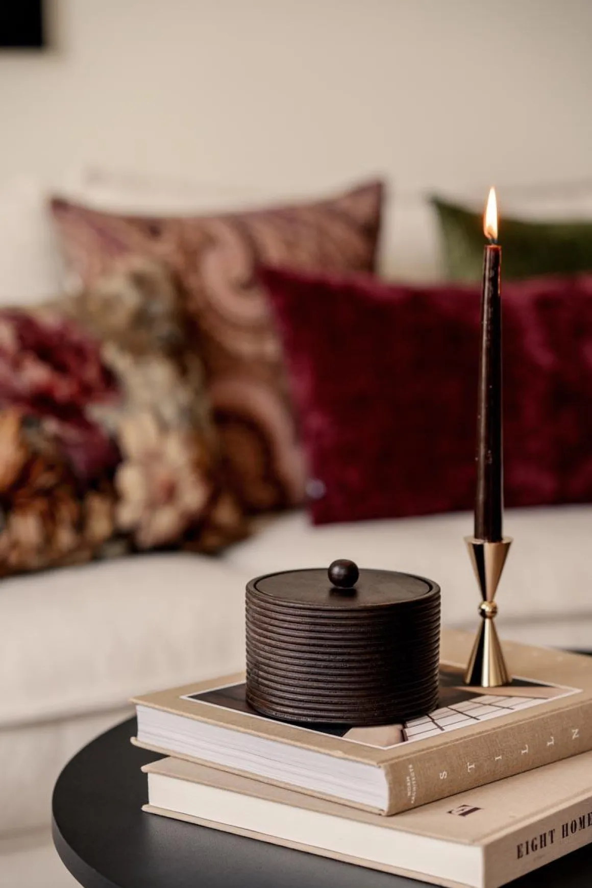 Med mørkt mangotre og fine riller hele veien rundt, skaper denne runde boksen en rolig kontrast til lyse flater. Lokk med liten knott på toppen gjør den enkel å åpne og lukke, enten du vil gjemme bort småting på badet, oppbevare smykker i gangen eller samle kontorklips på hjemmekontoret.