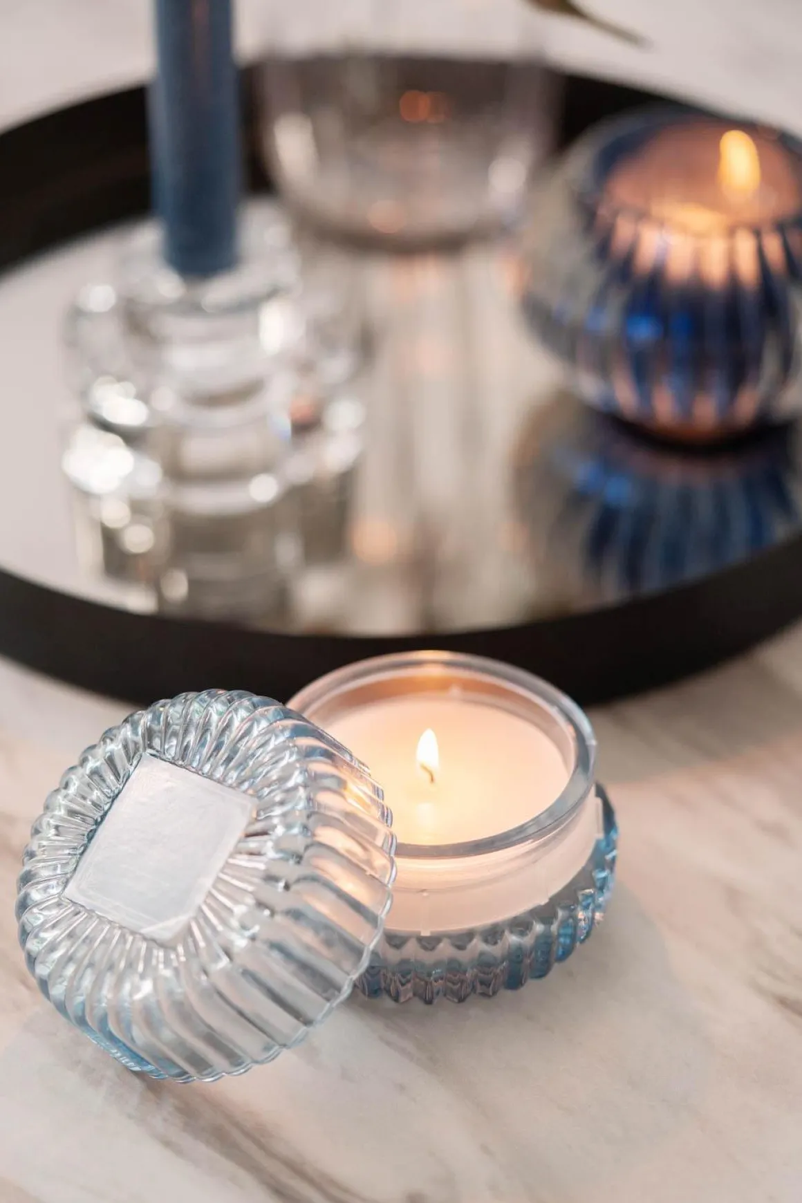Duftlyset fyller rommet med en ren og mild kombinasjon av hvit te og ingefær. Glasset har en vakker blå nyanse som passer like fint i stua som på badet. Når lyset er brent opp, kan krukken brukes som en liten oppbevaringsboks. Kombiner med andre duftlys eller matchende tekstiler for et gjennomført uttrykk. Perfekt som gave eller en liten hverdagsglede.