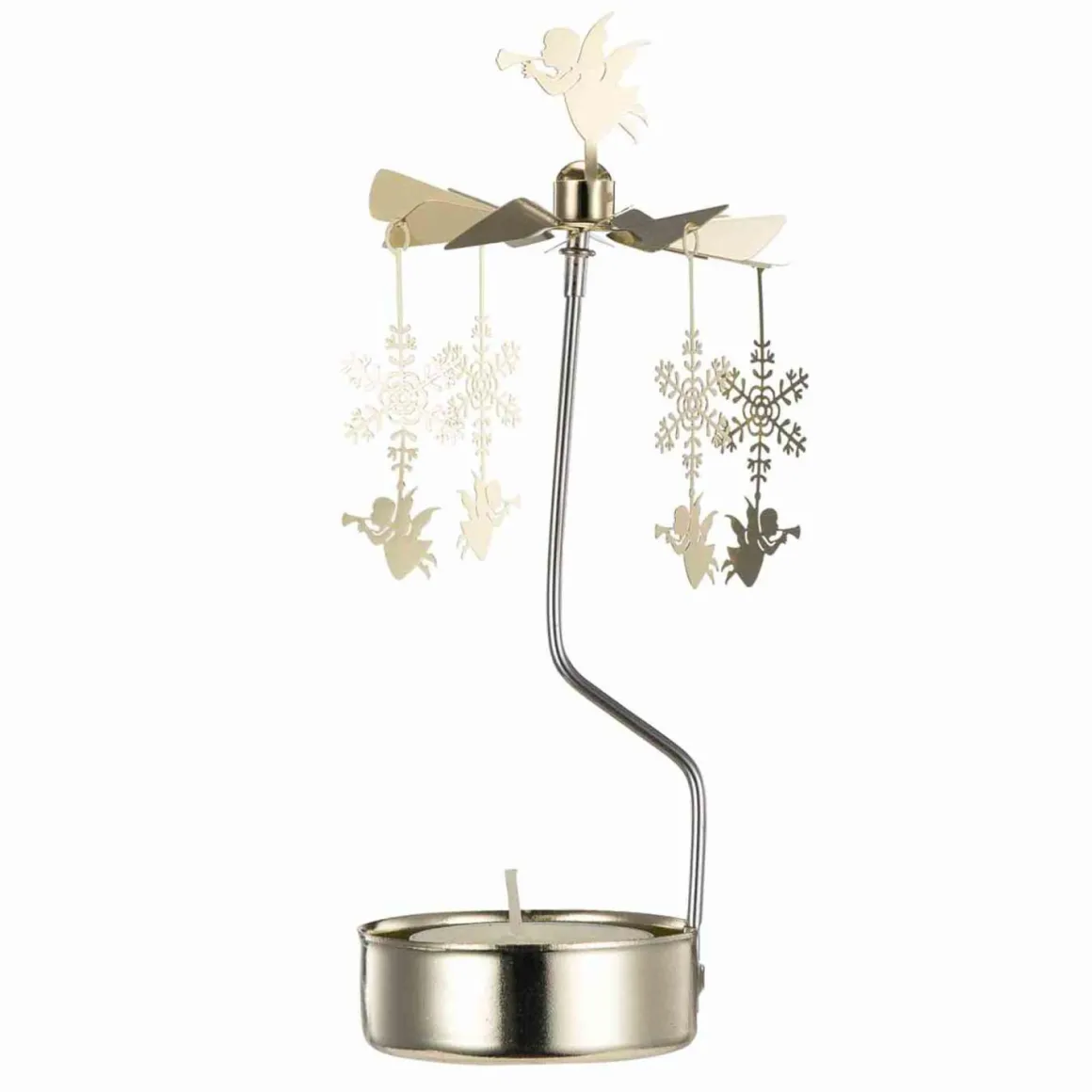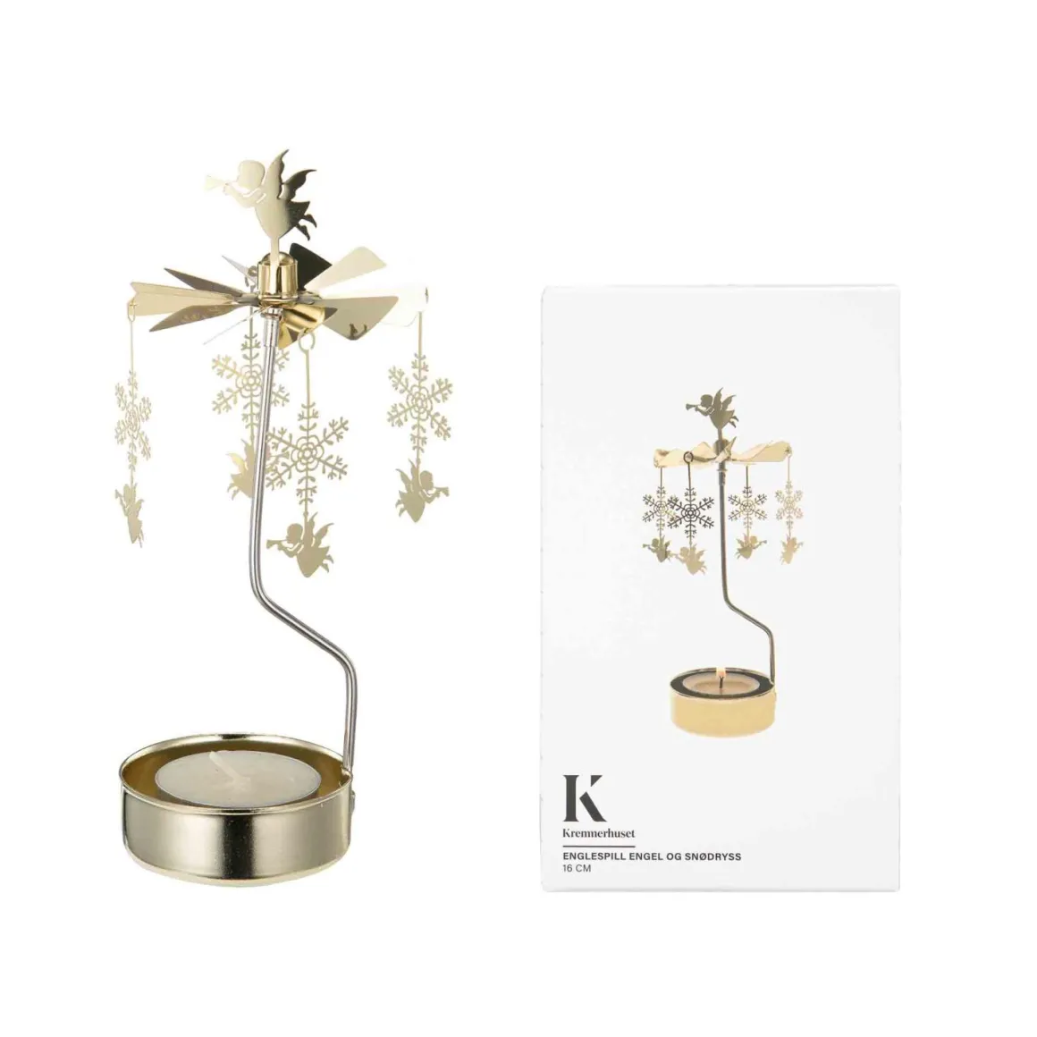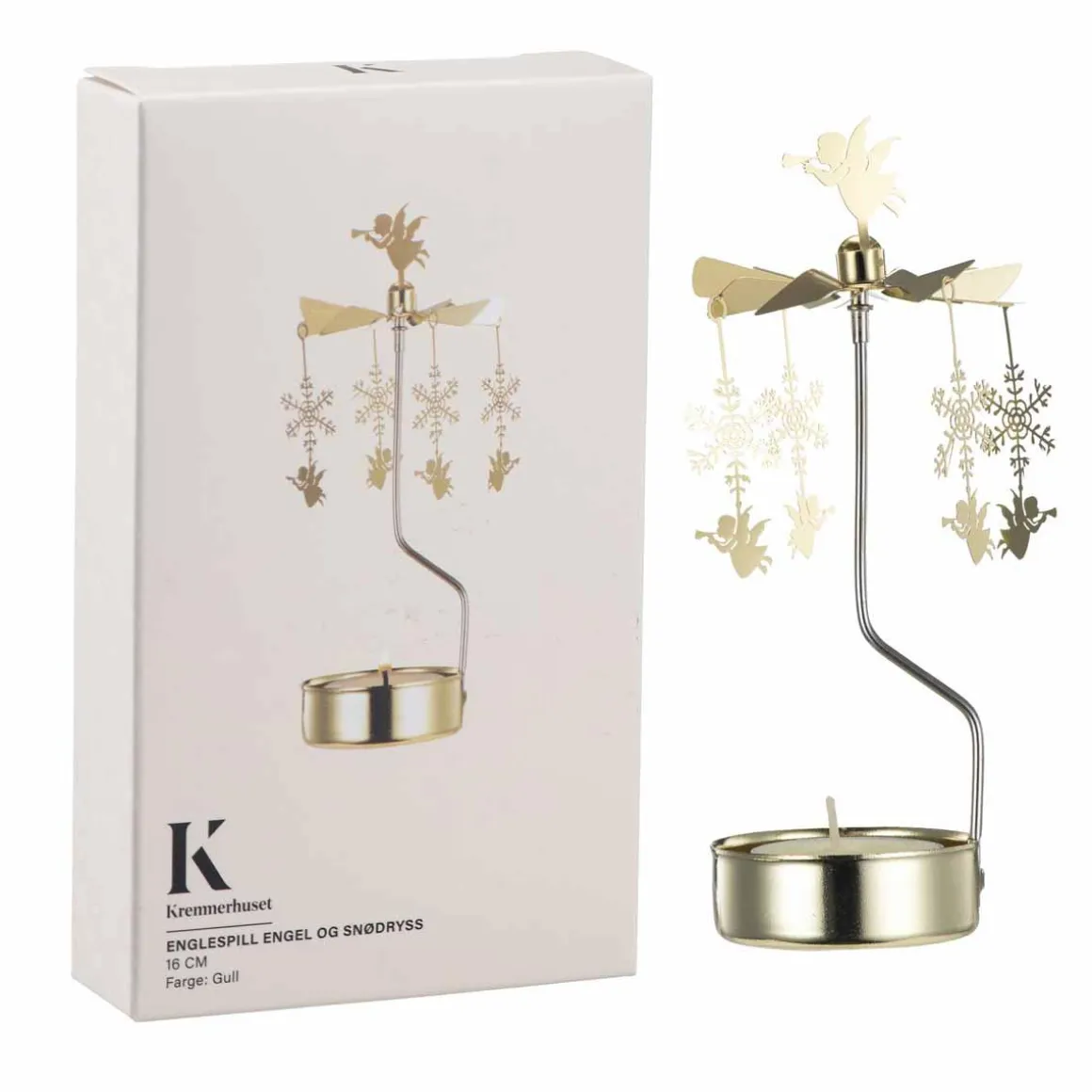 Lekkert englespill i gull som skaper en magisk atmosfære. Når lysene tennes, snurrer de små englene rundt. Perfekt som pynt i juletiden eller som en gave til noen du er glad i. Dette tidløse dekorelementet bringer varme og glede til ethvert hjem.