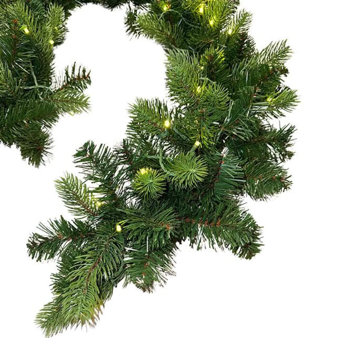 Dette er en grønn girlander med innebygde lys, som kan bidra til en lun stemning i hjemmet eller ved inngangspartiet. Girlanderen er enkel å forme og plassere, og lysene gjør at den skinner pent på mørke vinterkvelder. Heng den over peisen, langs en trapp eller rundt døren for en dekorativ effekt.