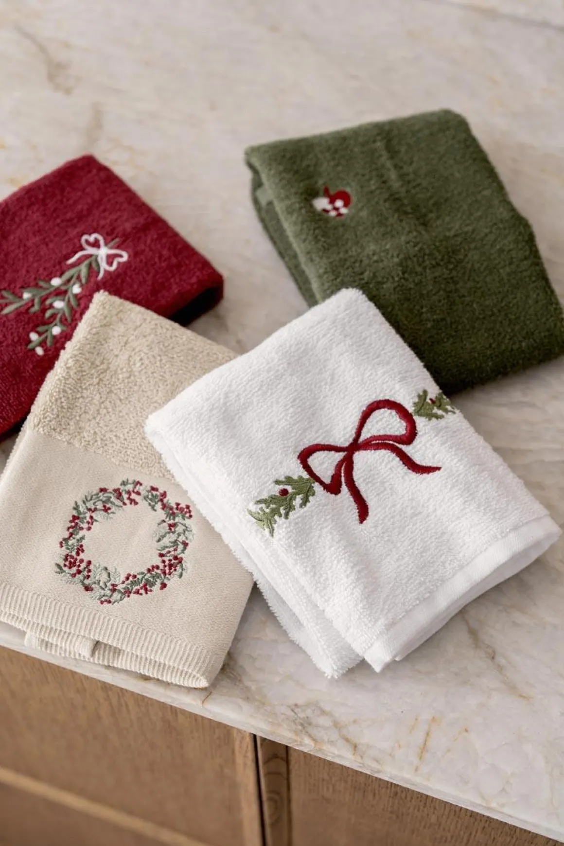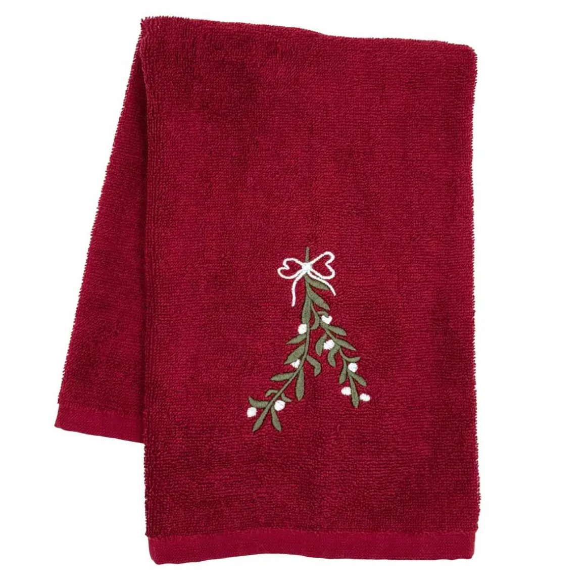 Et mykt og dekorativt gjestehåndkle i dyp rød farge, med brodert misteltein som gir en lun og tradisjonell julestemning på badet. Perfekt som en liten detalj i høytiden.