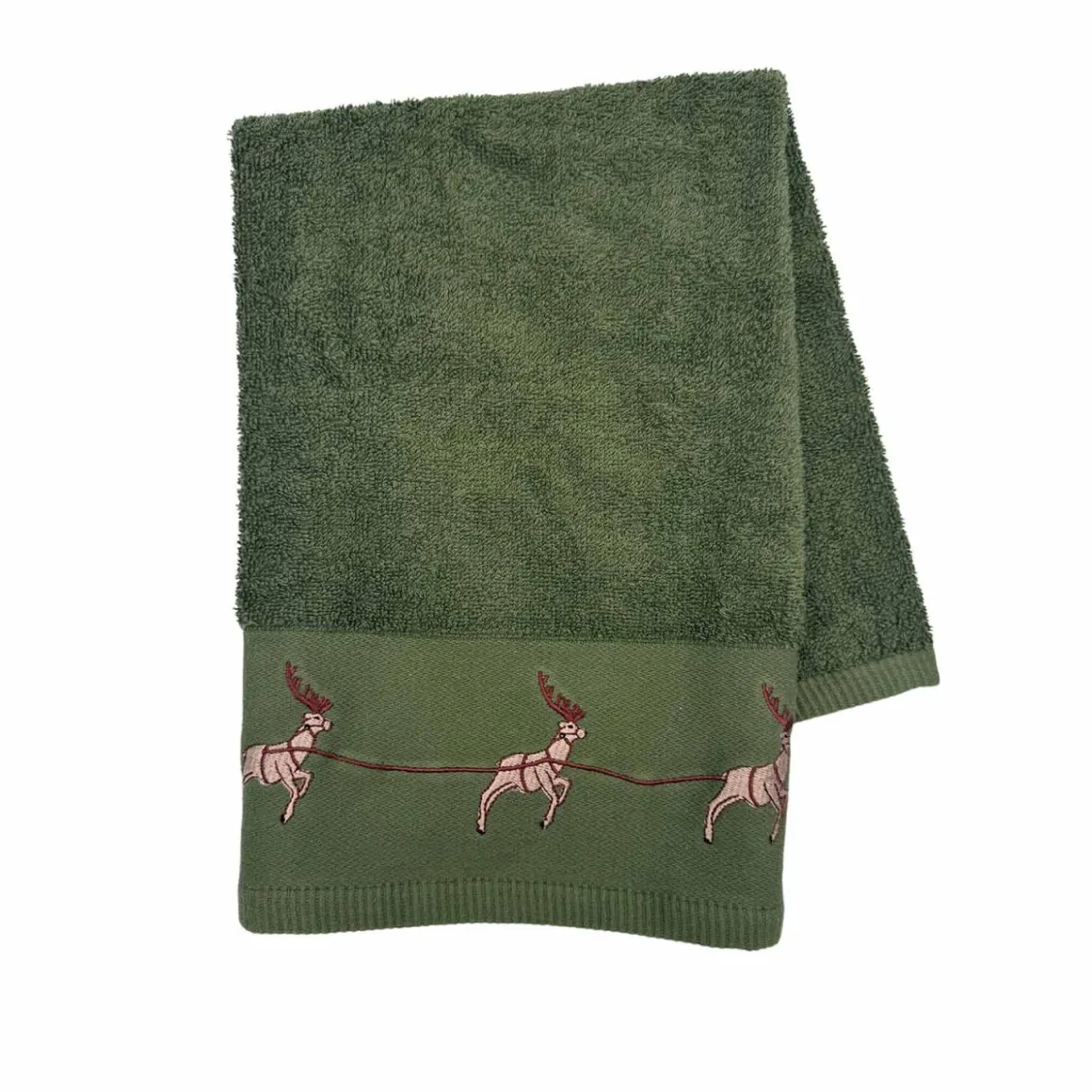 Dette grønne håndkleet er pyntet med en sjarmerende rad av reinsdyr brodert langs kanten. Perfekt for å tilføre litt juleglede på badet eller kjøkkenet. Laget av mykt materiale som gjør det behagelig å bruke til både hender og ansikt. En fin måte å feire høytiden på med praktiske detaljer som kan brukes hver dag. Lett å vaske og holde rent, slik at det kan tas frem år etter år. Passer også godt som en liten gave til noen som liker å pynte til jul.