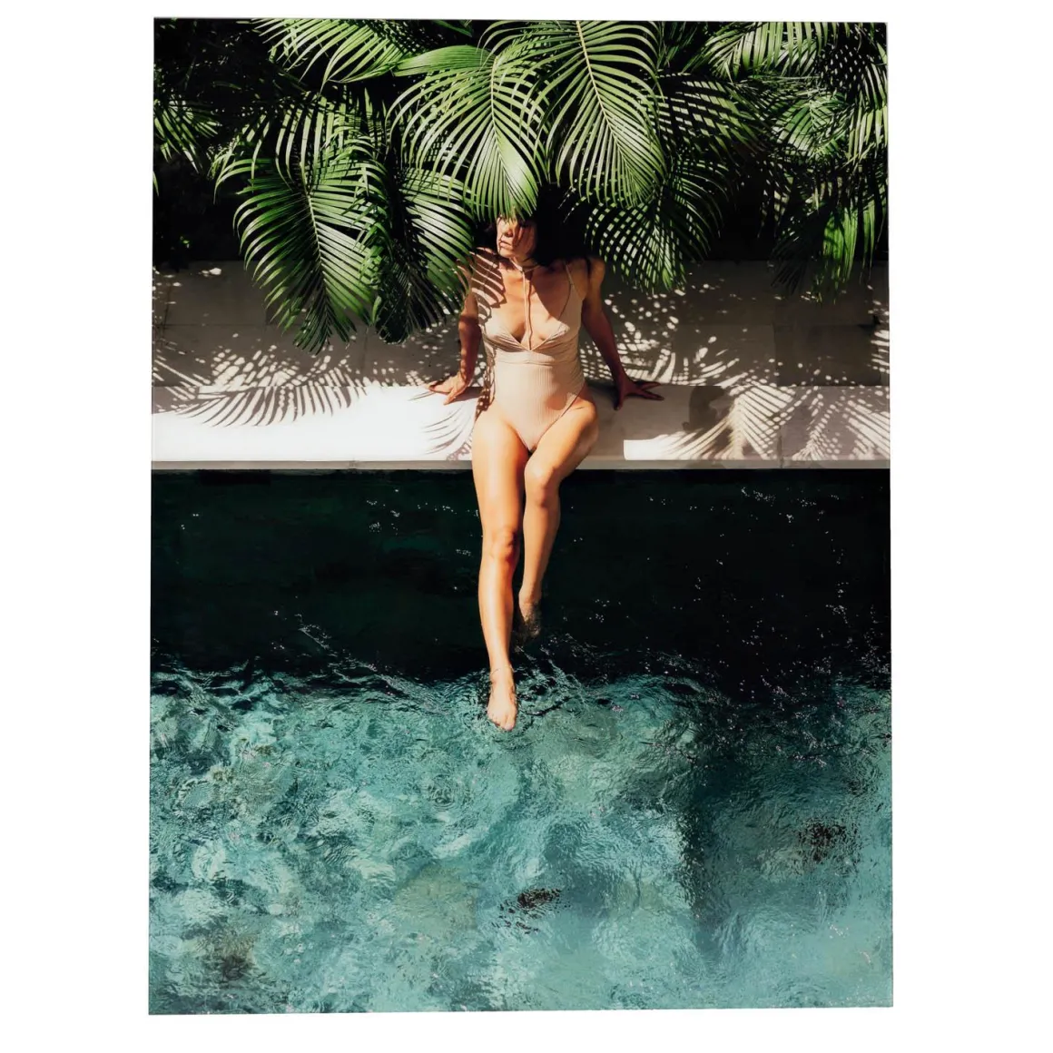 Råfint glassbilde av en dame i tropiske omgivelser. Her er det umulig å ikke få skikkelig sommerfølelse.
