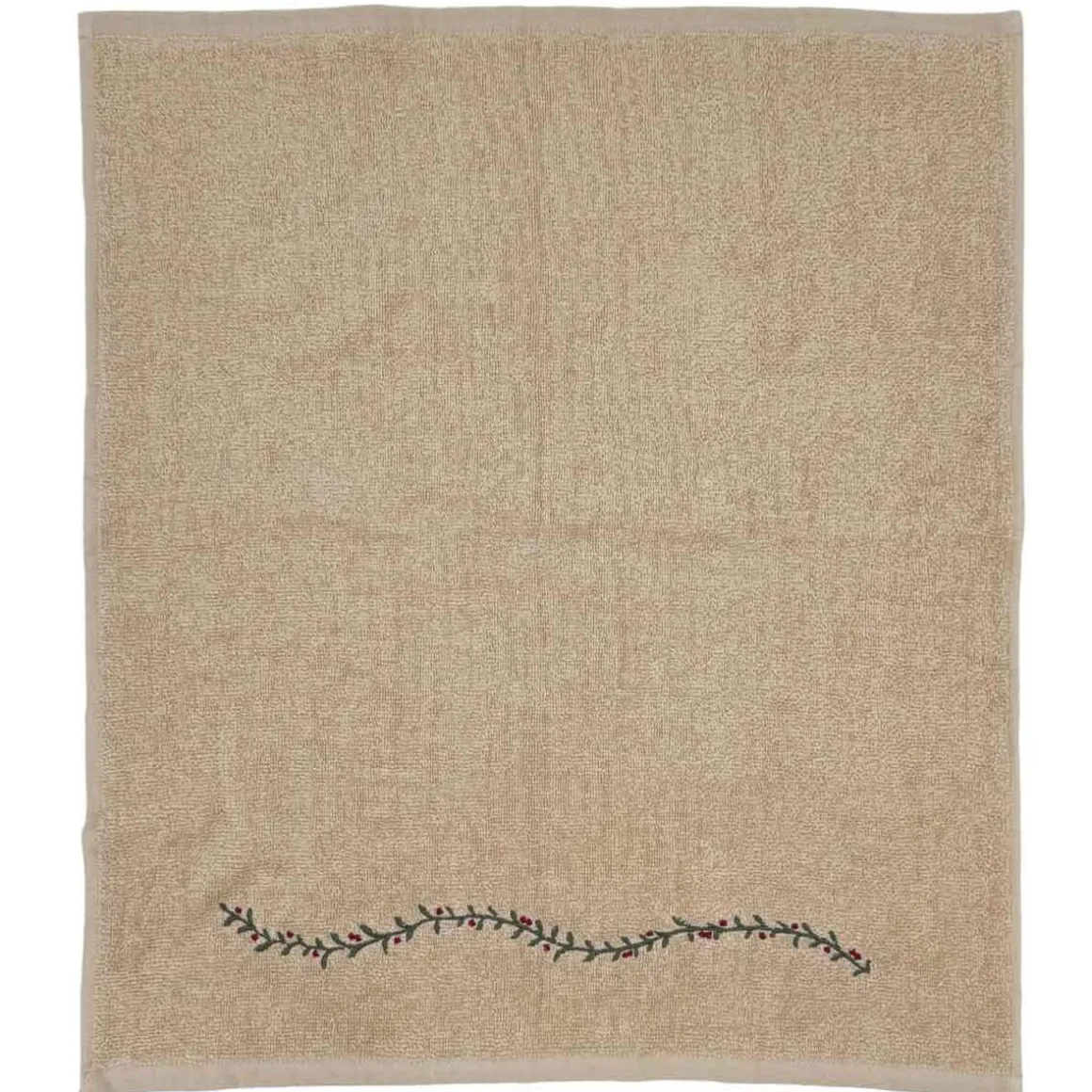 Mykt håndklesett med julebroderi av en grønn girlander med røde bær. Settet består av ett gjestehåndkle og ett badehåndkle i lun beige farge. Et stemningsfullt innslag til badet i høytiden – både praktisk og dekorativt.