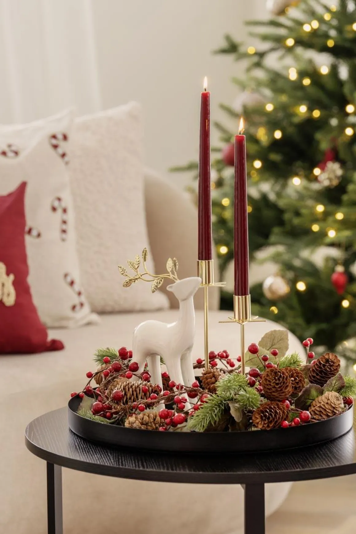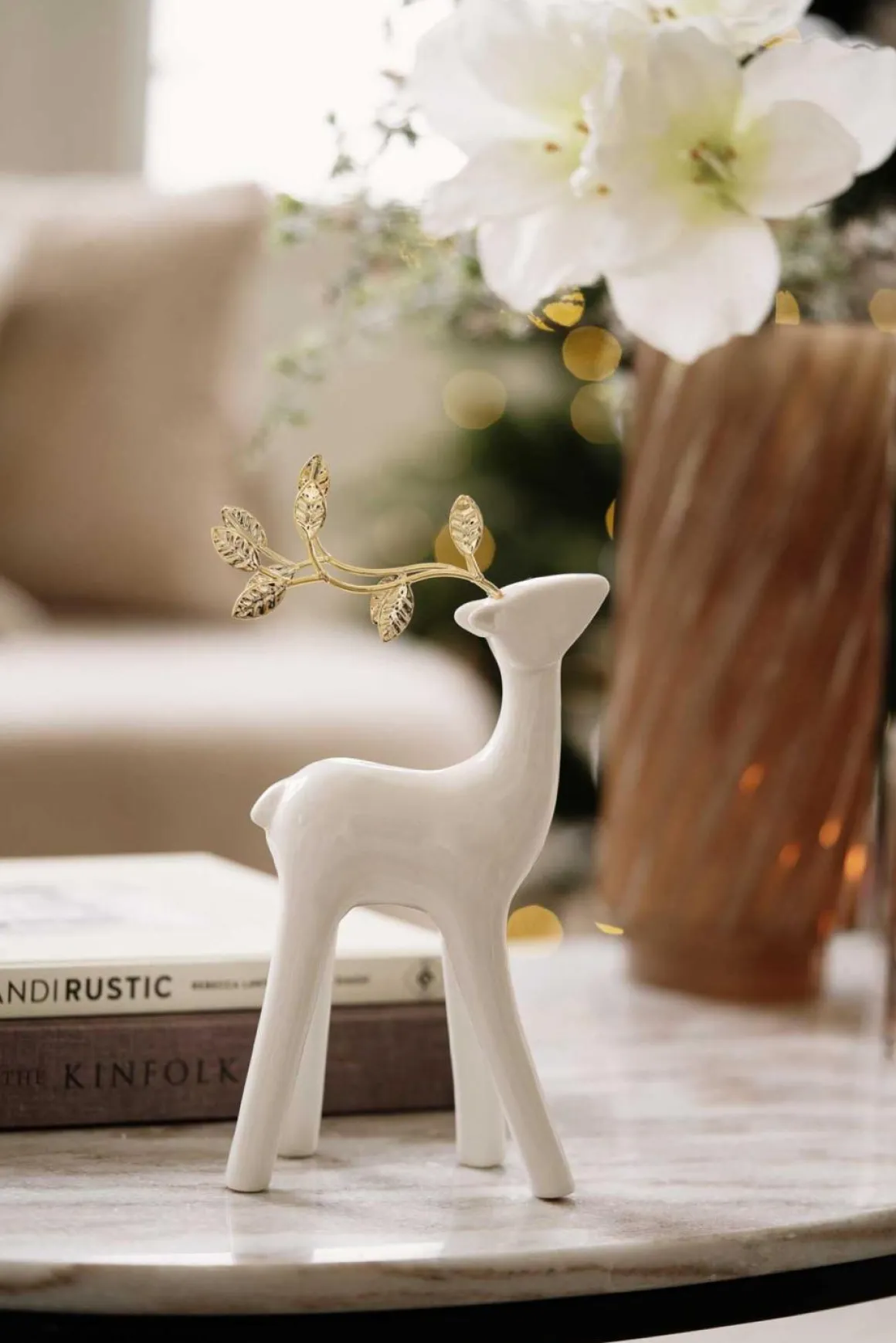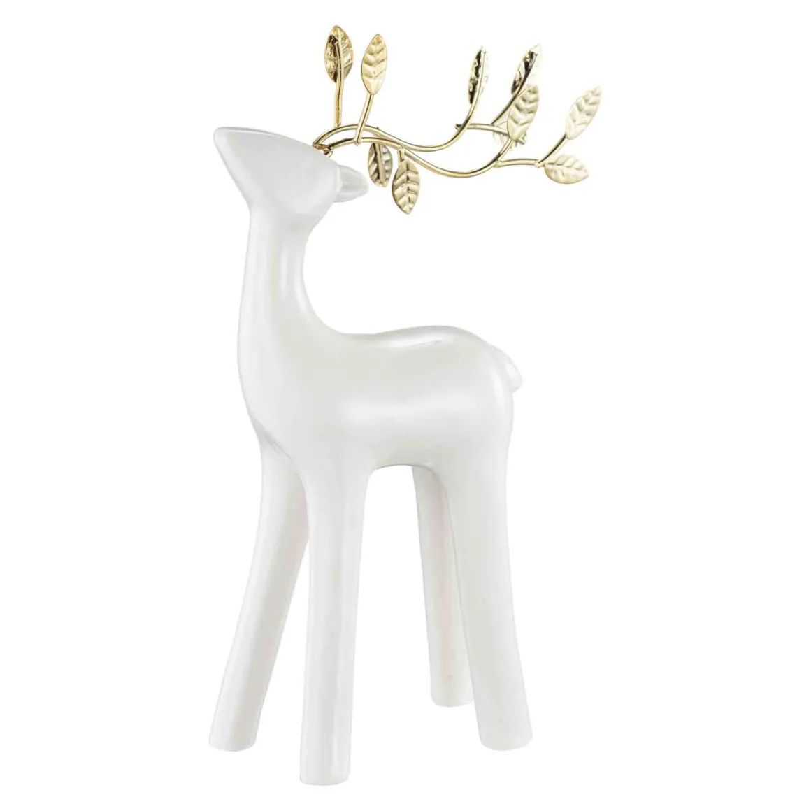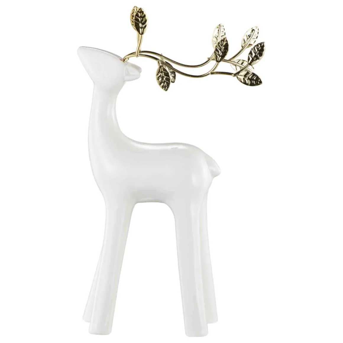En hvit hjort med gullhorn formet som små blader gir et stilrent preg til juledekorasjonene dine. Perfekt å plassere på et med lykter eller andre dekorasjoner!