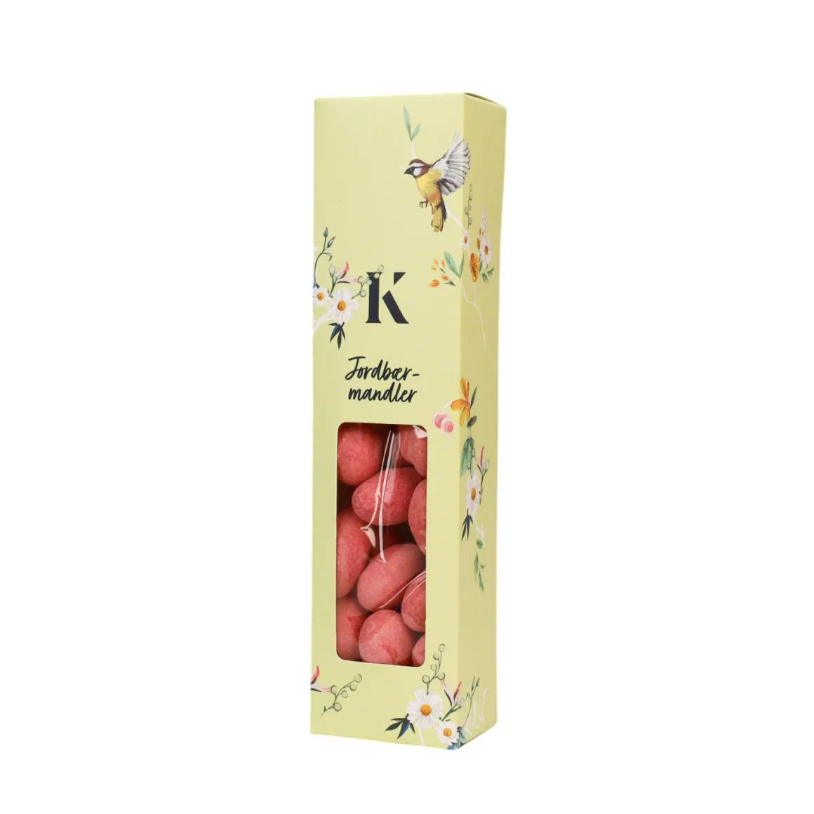 Ingredienser: Sukker, MANDEL (20%), kakaosmør, HELMELKSPULVER, MYSEPULVER, LAKTOSE, jordbærpulver, glukosesirup, emulgator (SOYALECITIN), jordbærsmak, rødbetejuice, naturlig vaniljesmak. Den hvite sjokoladen inneholder minst 25% kakaokomponenter. Kan inneholde spor av HASSELNØTT, CASHEWNØTT, PARANØTT og PECAN.