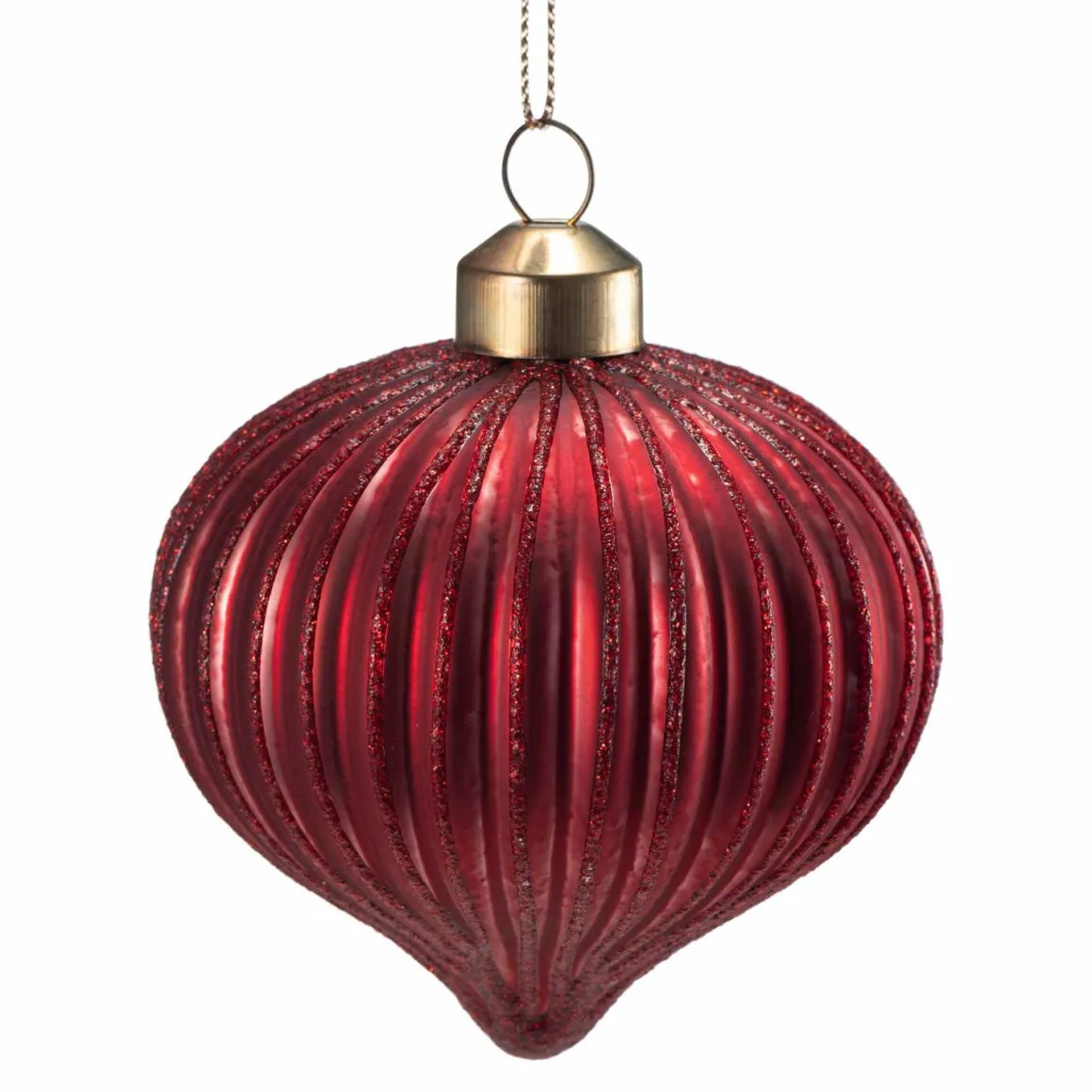 Nydelig rød julekule i glass med riller. Morsom og leken form som passer perfekt på juletreet denne julen. Frisk opp og pynt et tre som gjenspeiler din smak og personlighet. Kombiner den gjerne med de andre fargene av .