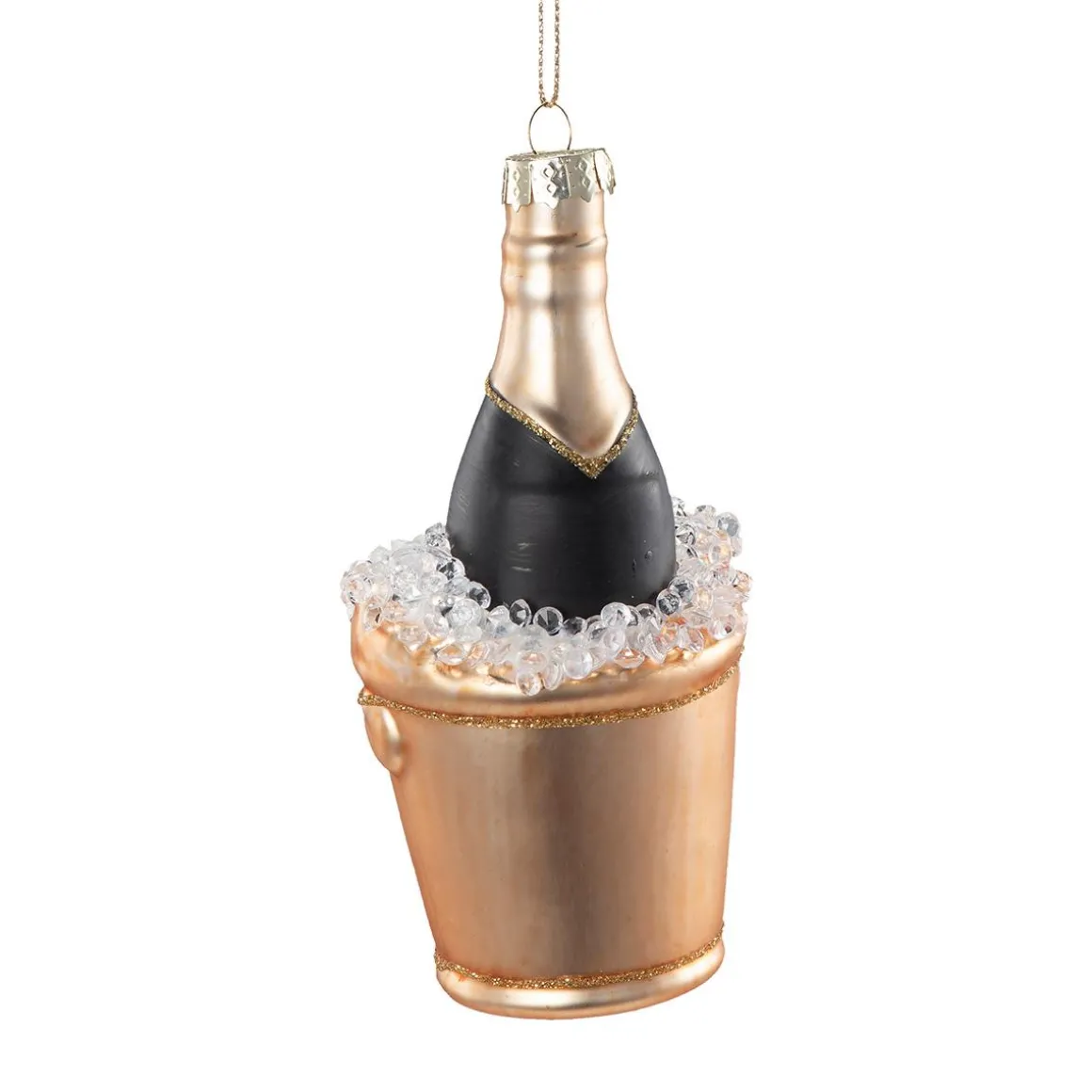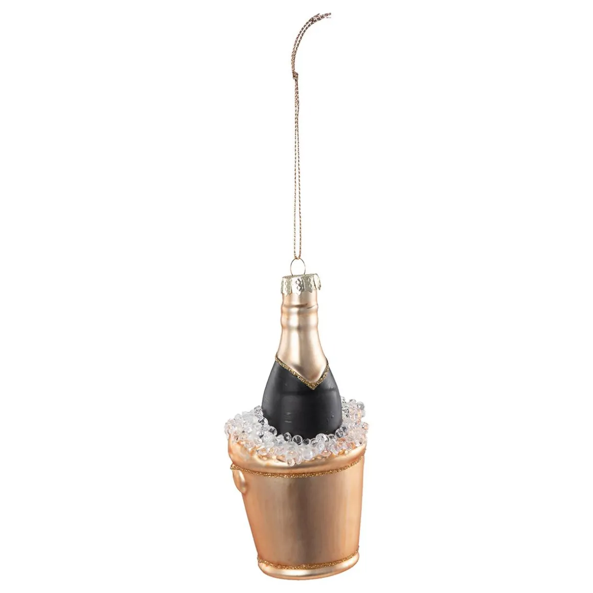 Gi juletreet en feirende detalj med denne julekulen formet som en champagneflaske i isbøtte. Et sjarmerende innslag som passer både til fest og tradisjon. Du finner flere unike og morsomme i vårt sortiment som skaper liv i juletreet.