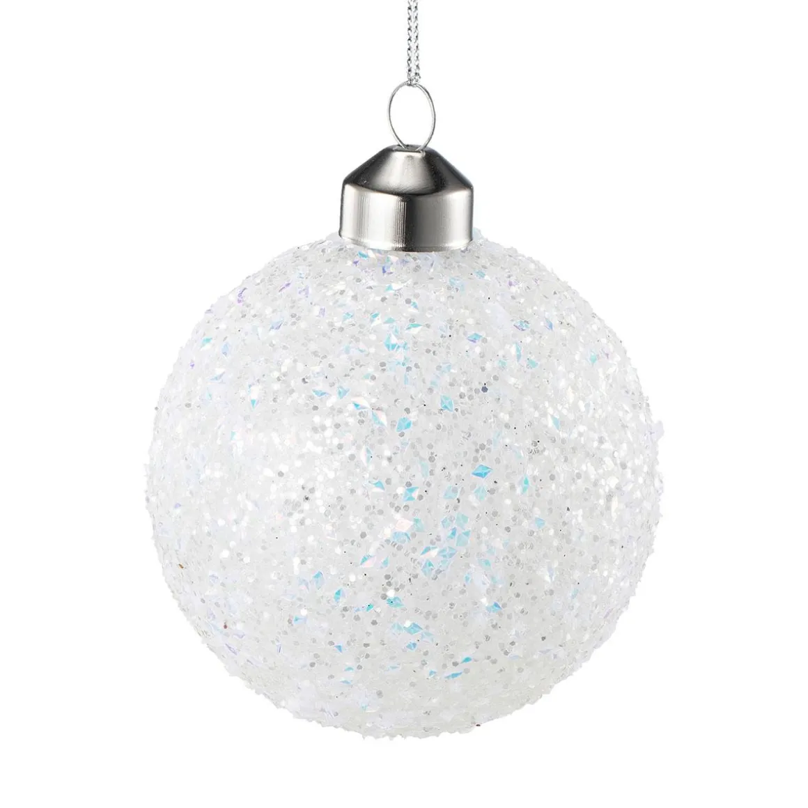 Denne julekula glitrer som nysnø med sin frostede overflate og små skinnende detaljer som fanger lyset vakkert. En fin kontrast til dypere fargetoner på treet. Kombiner den med våre andre for en gjennomført og stemningsfull juledekorasjon.