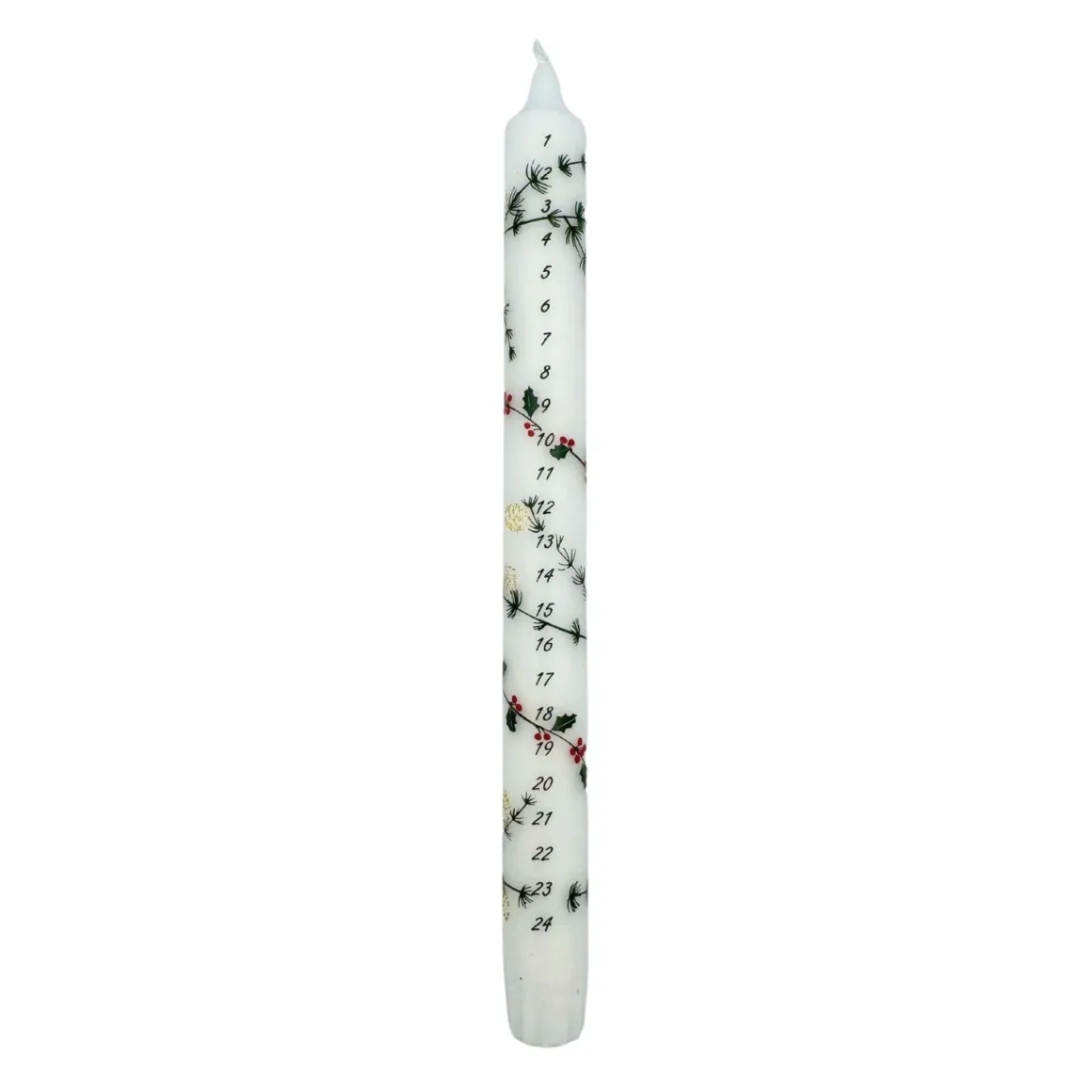 Dette kalenderlyset teller ned dagene til jul med tall fra 1 til 24 langs lysets lengde. Hvert tall er dekorert med en vakker krans av vintergrønt, kongler og bær som slynger seg rundt lyset. Tennes daglig for å markere en ny dag i desember fram til julaften. Perfekt for å skape en stemningsfull ventetid i adventsperioden.