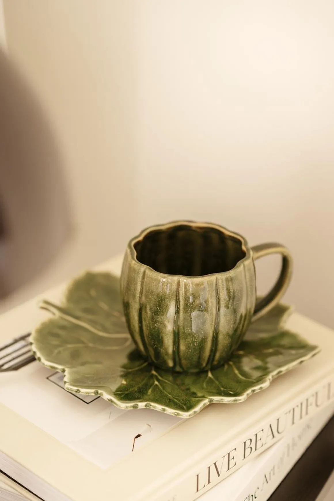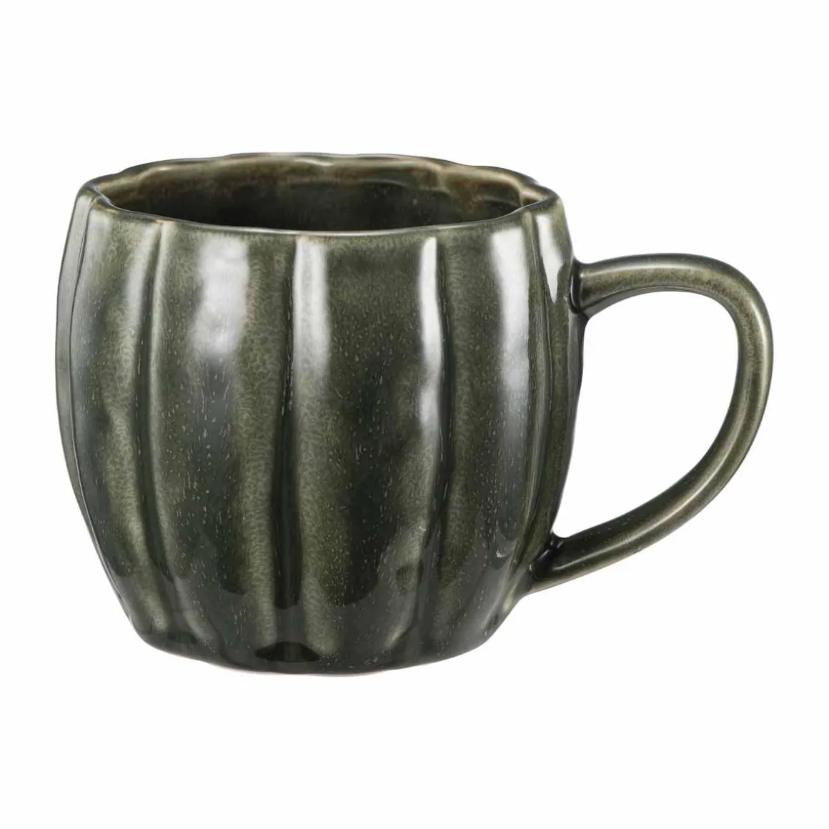 En kopp med plass til både kaffe og kos. Den grønne glasuren gir et varmt uttrykk, og formen minner litt om et gresskar – perfekt for sesongen.