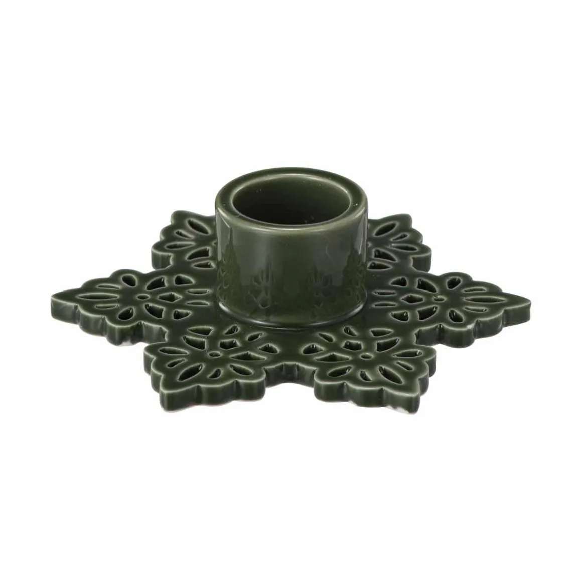 En liten, sjarmerende lysestake med snøflakdetaljer i grønn. Perfekt for høytidens lys og dekorasjoner! Finnes også i !