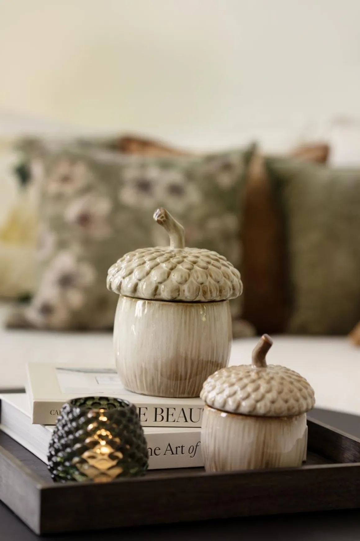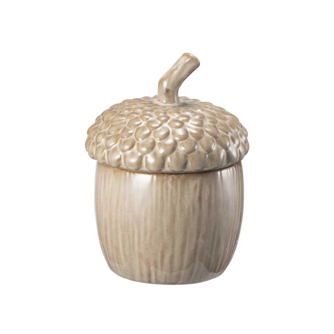 Denne nøtteformede krukken trives like godt som pynt på en hylle som den gjør med hårstrikker eller nøkler gjemt inni seg. Nydelig alene, men enda hyggeligere sammen med den – en liten duo som gir lune høstvibber hvor enn de plasseres.