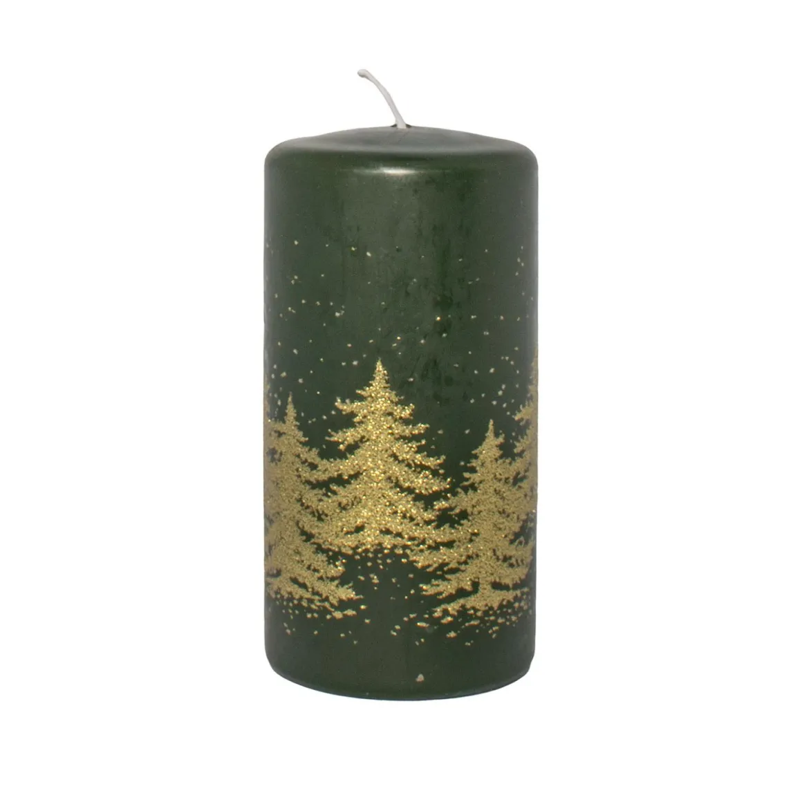 Kubbelys i dyp grønn med dekorative gullglitrende juletrær. Lyset gir en varm og festlig glød som passer perfekt til julens oppdekning og vinterlige kvelder.
