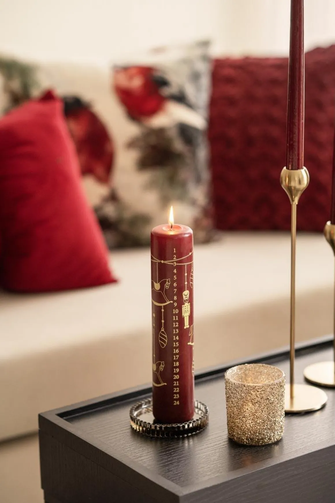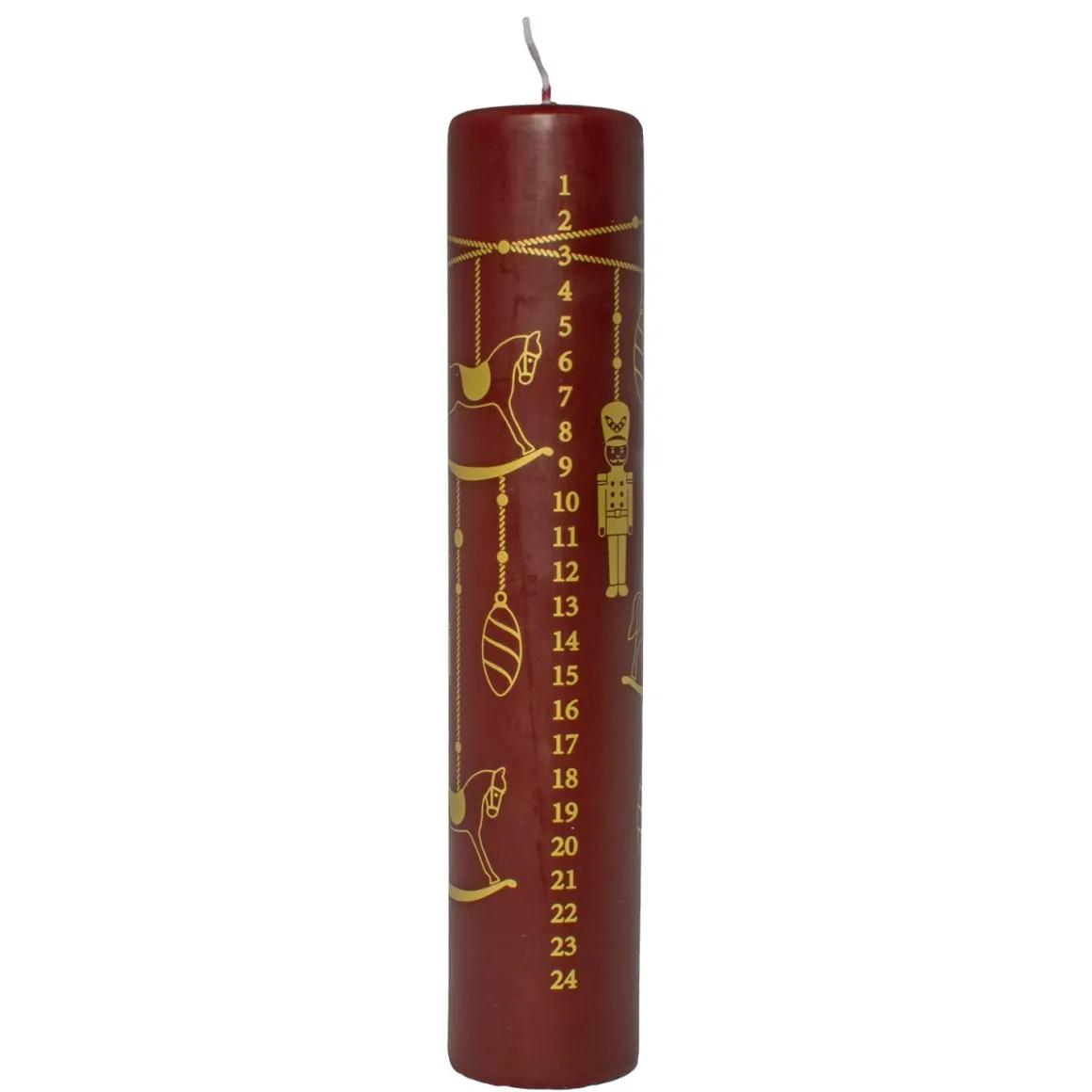 Kalenderkubbelys i dyp rød med gullmotiv og tall fra 1–24. Tenn lyset litt hver dag og tell ned til julaften på en stemningsfull måte. Perfekt for adventshygge.