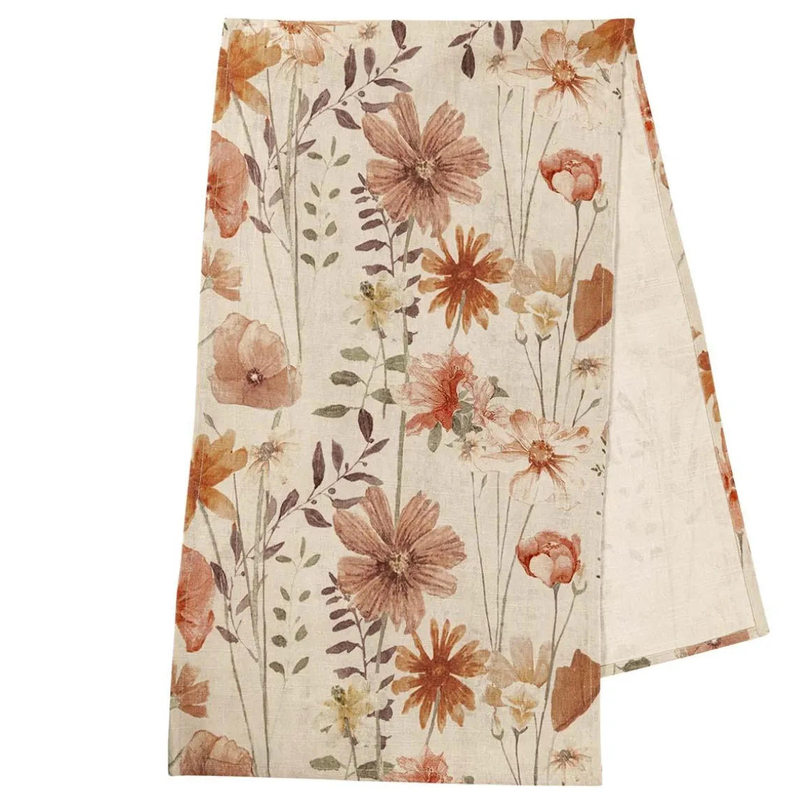 Blomstene gir bordløperen et lett og levende uttrykk, med fine detaljer i dus rød, oker og rolig grønt. Passer godt alene på et mindre bord eller over en duk på større selskap.