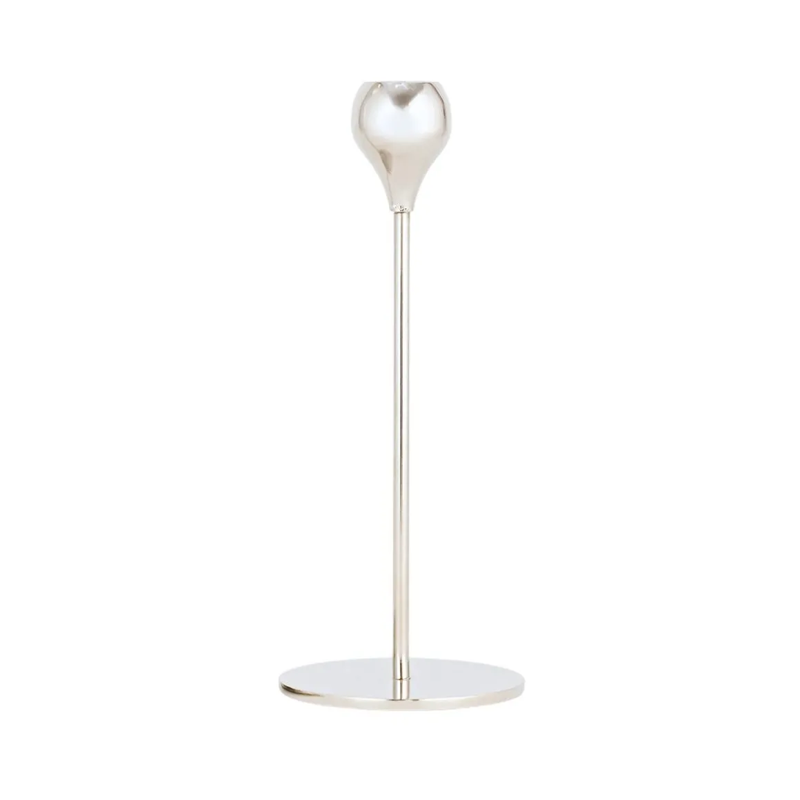 Kronelysestaken har et slankt stativ med blank overflate og en tulipanformet topp som gir plass til et klassisk kronelys. Den står stødig og passer godt både på dekket bord og i en vinduskarm.