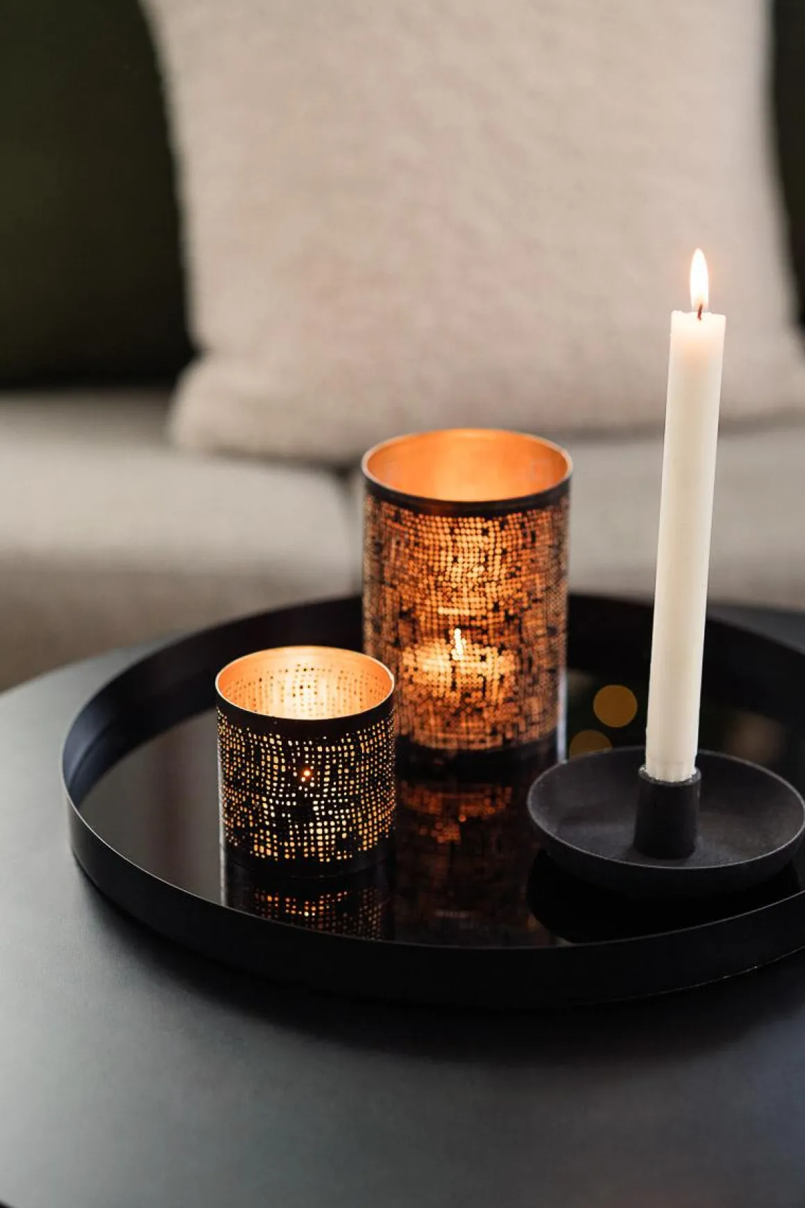 Stilig kronelysestake i sort metall, røff og ru overflate som gjør seg like god i hyllen som på sofabordet. Plasser på og gjør klart til julepynten som skal frem. Passer perfekt med i samme serie!