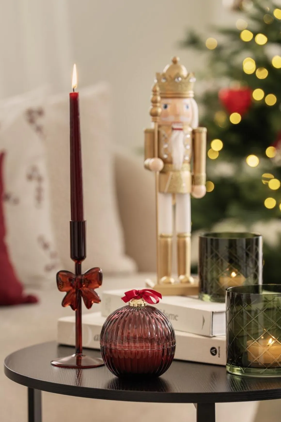 En dekorativ lysestake i rødt som sprer både varme og stemning. Den vakre sløyfedetaljen gjør den til et blikkfang, perfekt på festbordet eller som en koselig juledekorasjon. Ikke glem et for å sette stemningen!