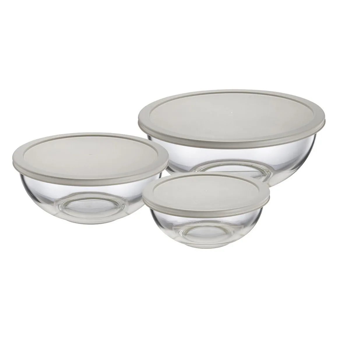 Praktisk og allsidig bollesett i glass med lokk – perfekt til både servering, oppbevaring og matlaging. Settet består av tre boller i ulike størrelser, alle med tilhørende plastlokk som holder maten fersk lenger. Glassbollene er gjennomsiktige, slik at du enkelt ser innholdet, og de kan stables for plassbesparende oppbevaring i skapet.