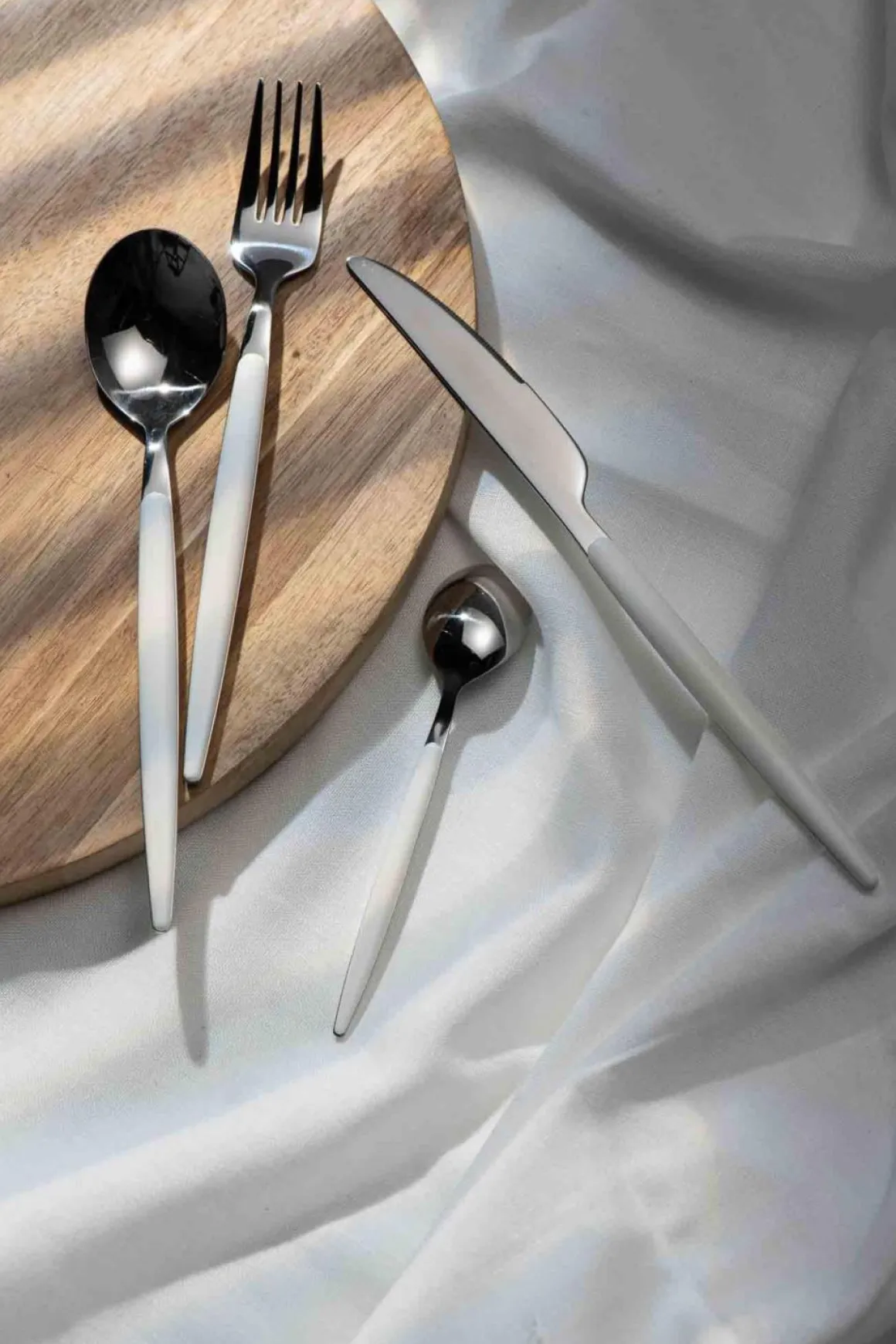 Dette bestikksettet for 4 personer kombinerer retrodesign med både klassiske og moderne elementer. Håndtakene er laget av PP-plast, som sikrer at bestikket tåler oppvaskmaskin uten å bli matt eller flisete. Laget av høykvalitets stål (18/8, med knivblad i 13/0), er bestikket motstandsdyktig mot flekker og korrosjon. Vær imidlertid oppmerksom på at selv de beste legeringene kan svekkes ved kontakt med etsende eller syreholdige matvarer, salt, hardt vann eller sterke vaskemidler. For best resultat, vask bestikket på et skånsomt oppvaskmaskinprogram.