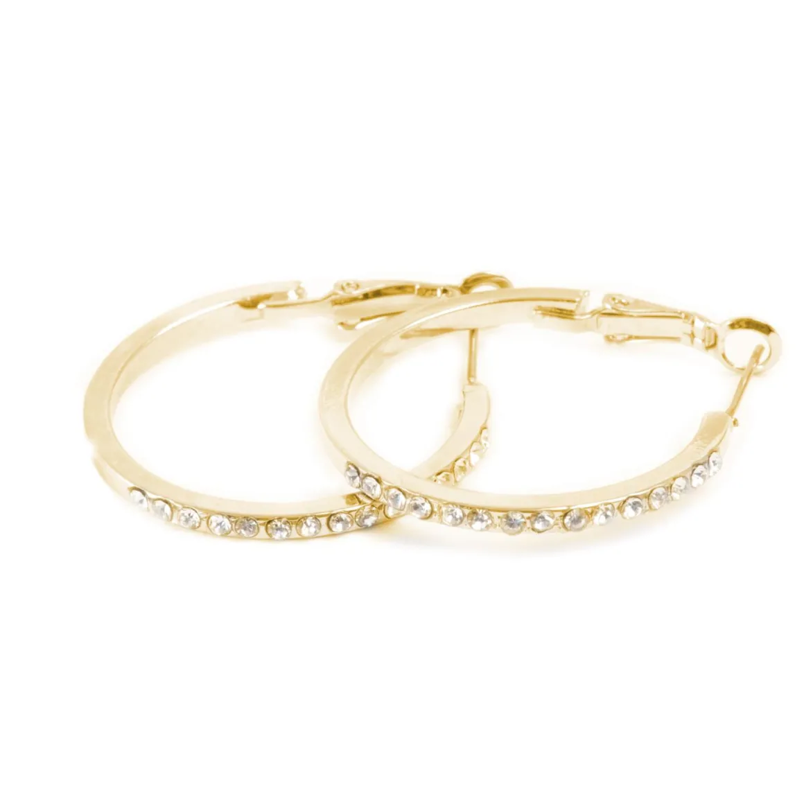 Enkle øreringer i en blank gullfarget firkantprofil med krystallsteiner og en god klypelås som er lett å ta av og på. Kommer i flere størrelser, disse er medium.