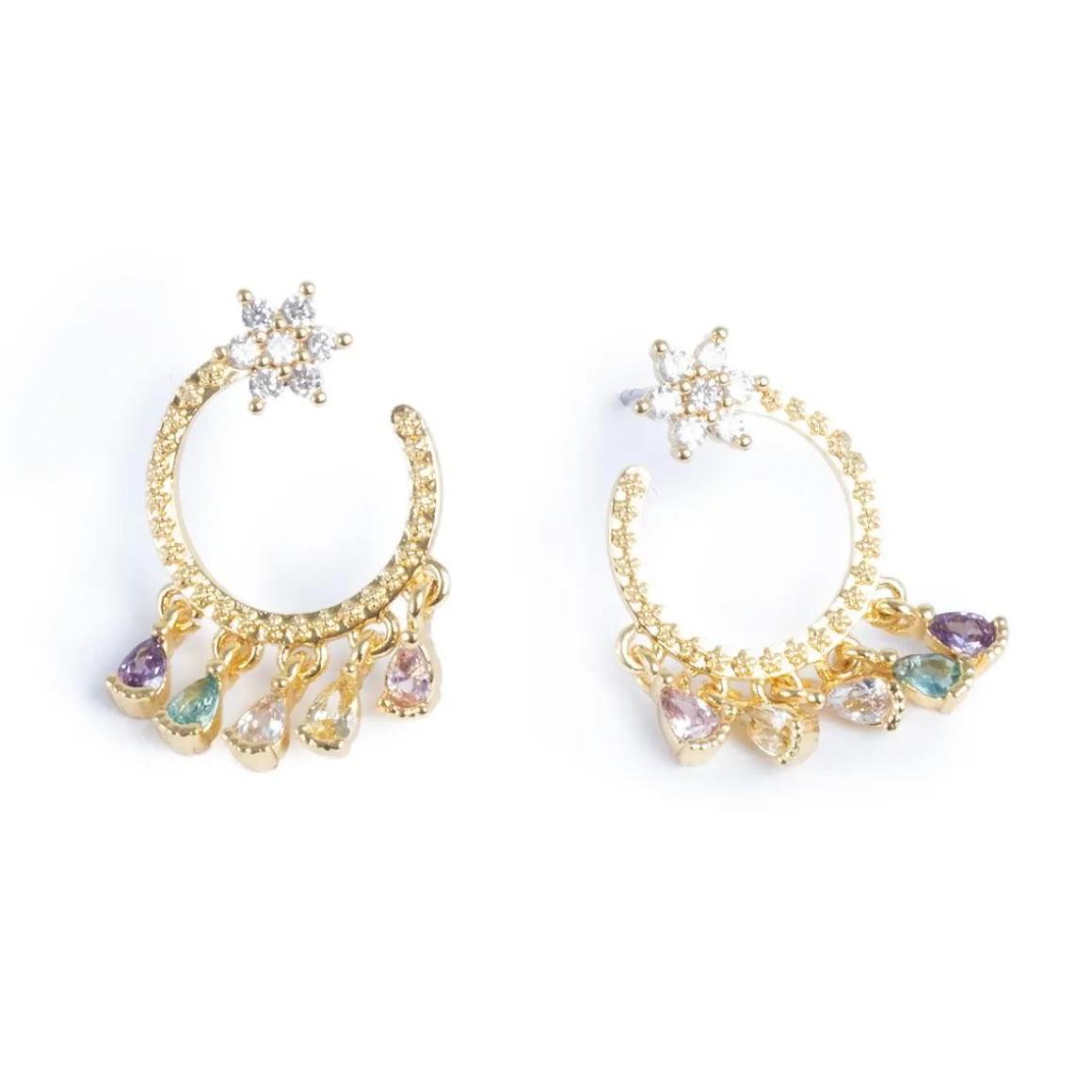 Øreringer med charm i gull, dekorert med stjerne og hengende diamanter i søte pastellfarger.