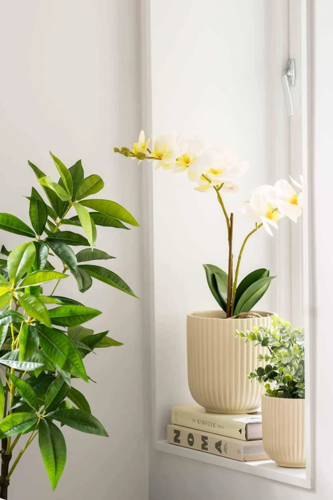 Denne elegante blomsterpotten har et tidløst og minimalistisk design med vertikale riller som gir et moderne uttrykk. Den er laget av keramikk i en varm, beige fargetone som passer perfekt inn i både klassiske og moderne interiører.
