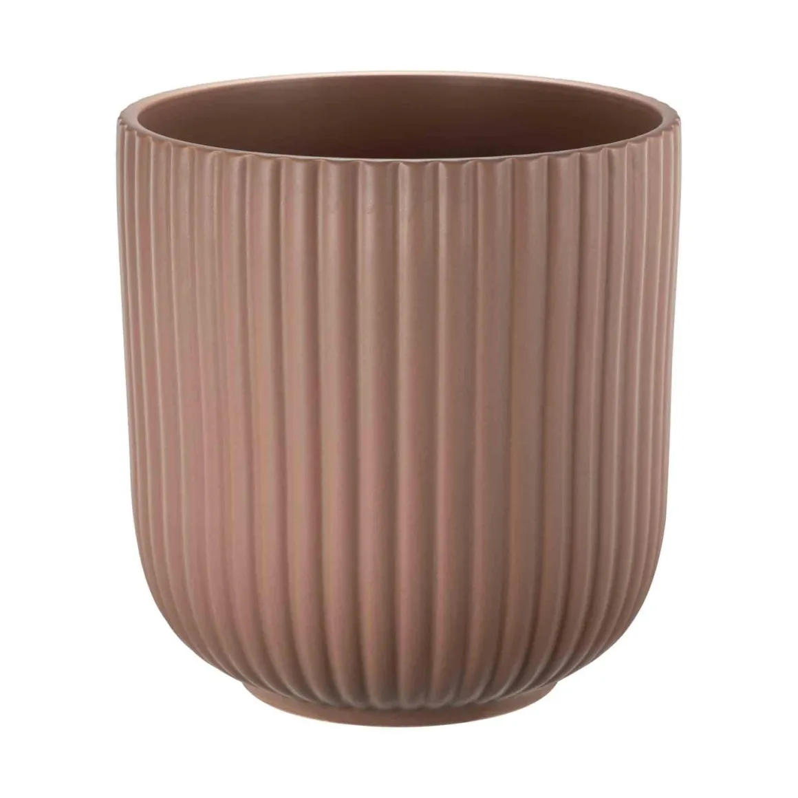 Stilig og elegant blomsterpotte med riller som gir et moderne uttrykk. Den er laget av keramikk i en varm bruntone som passer perfekt inn i både klassiske og moderne interiører.