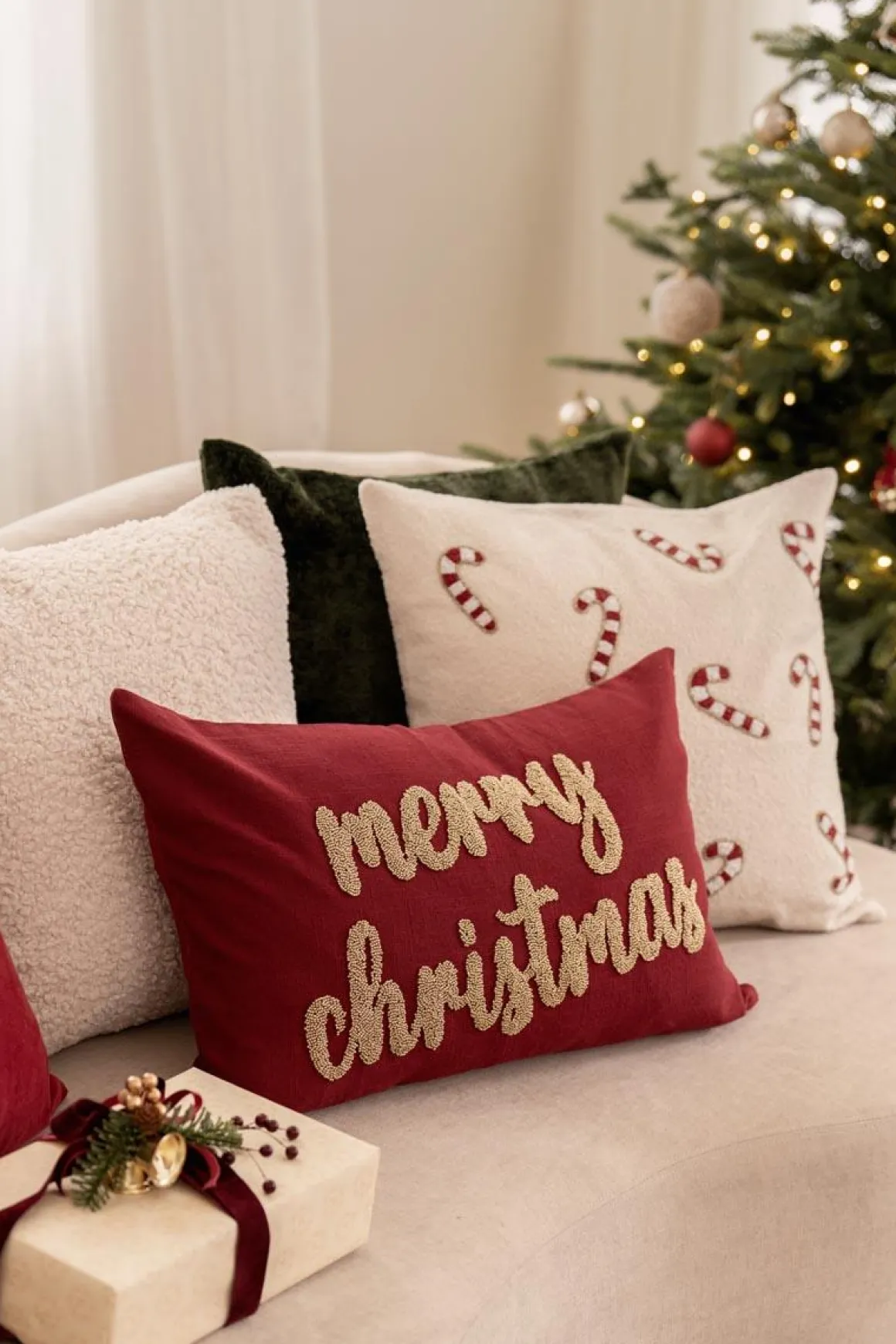 Putetrekk Perler Merry Christmas med elegant gullskrift gir hjemmet et festlig og luksuriøst preg til jul. Mykt materiale gjør det behagelig, mens det glitrende “Merry Christmas”-motivet skaper en varm og koselig stemning i sofaen, godstolen eller sengen. Perfekt alene eller kombinert med andre for et komplett juleuttrykk.