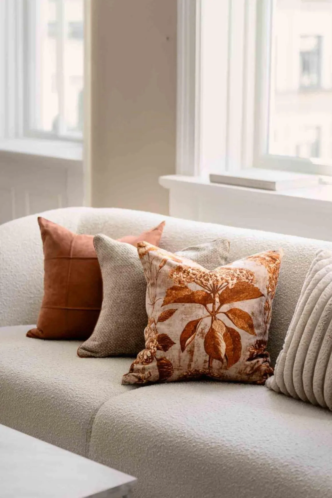 Et putetrekk i deilig velur med høstblomster i flere nyanser av brun og beige. Det perfekte tillegget til sofakroken på høsten for et delikat og behagelig uttrykk.