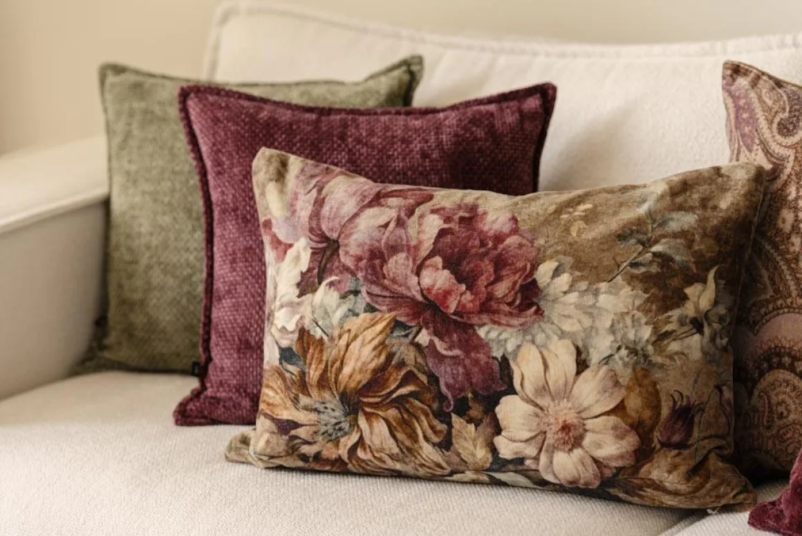 utetrekket har en myk, vevd overflate på den ene siden og en glatt, dyp fargetone på den andre. Fargen gir varme til sofaen eller sengen, og kombineres lett med både beige og jordtoner. Glidelåsen er diskret plassert, slik at puten kan snus etter humør eller sesong.