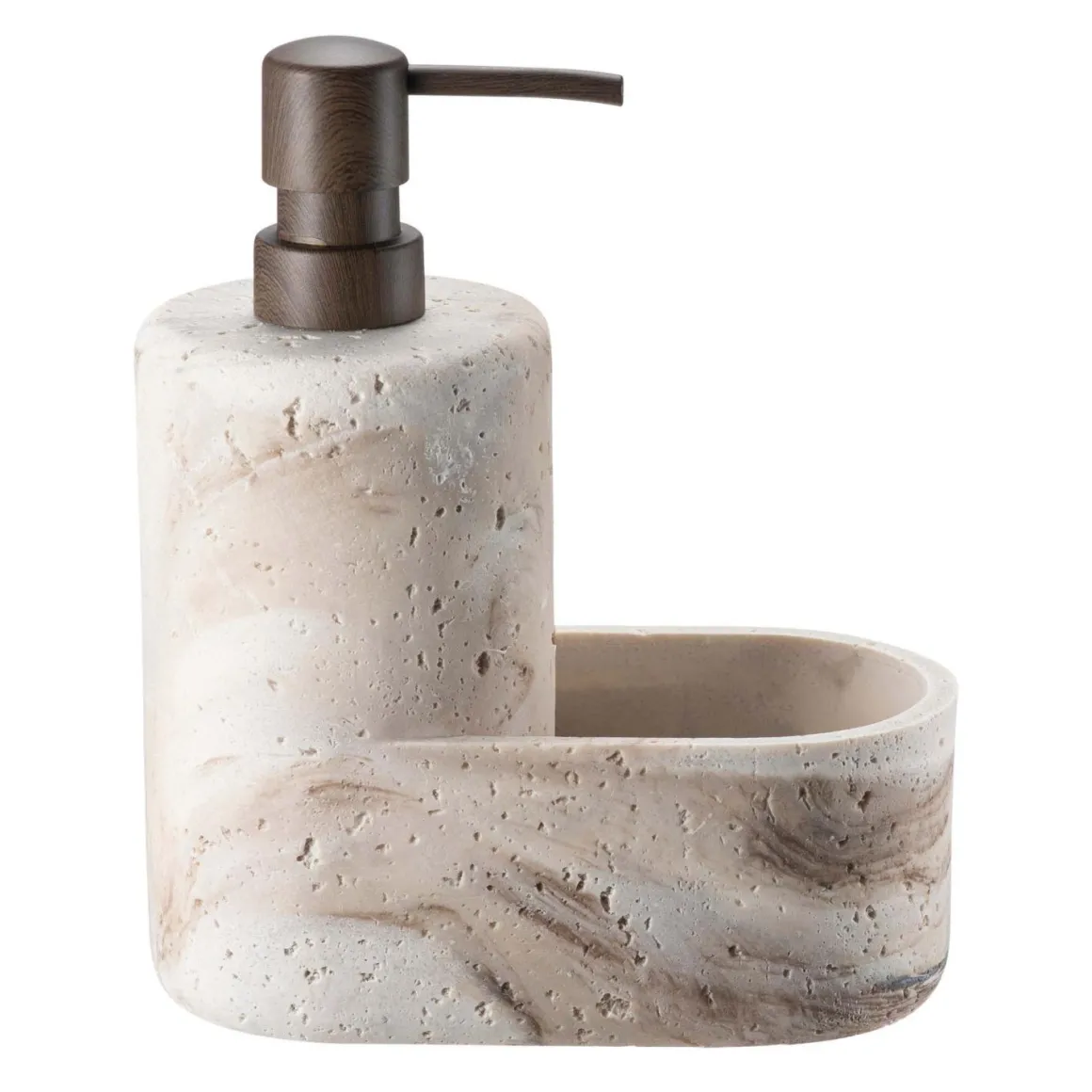 Lekker såpedispenser med oppbevaringssone med beige marmorfinish, passer perfekt til ditt kjøkken. Fullfør stilen sammen med redskapsholder Helene, denne finner du