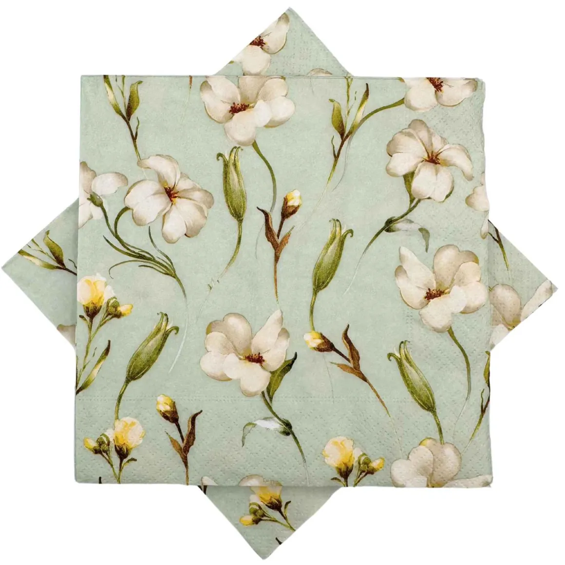Servietten har et nydelig mønster med elegante blomster på en lys bakgrunn. Perfekt for vårens og sommerens borddekking.