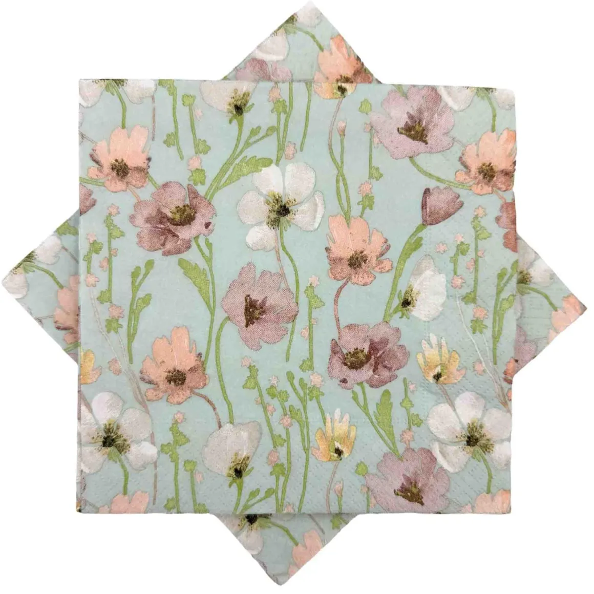 Disse serviettene bringer med seg en frisk følelse av vår, med sitt mønster av delikate blomster i lyse farger på en blå bakgrunn. Perfekte til vårbordet eller til små sammenkomster på uteplassen.