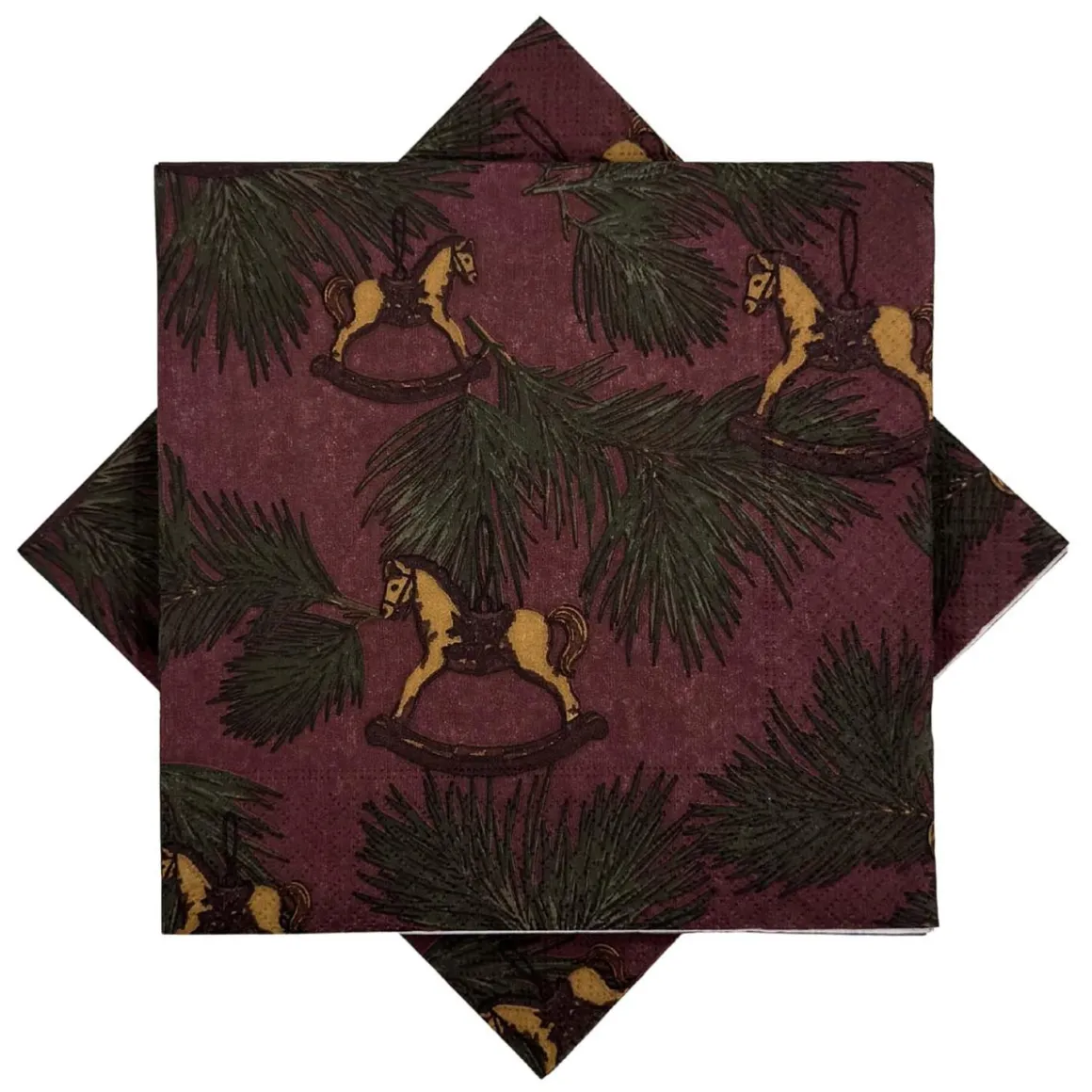 Papirserviett med nostalgisk julemotiv av gyngehester og grønne granbar på dyp rød bakgrunn. Skaper en lun og klassisk stemning rundt bordet.