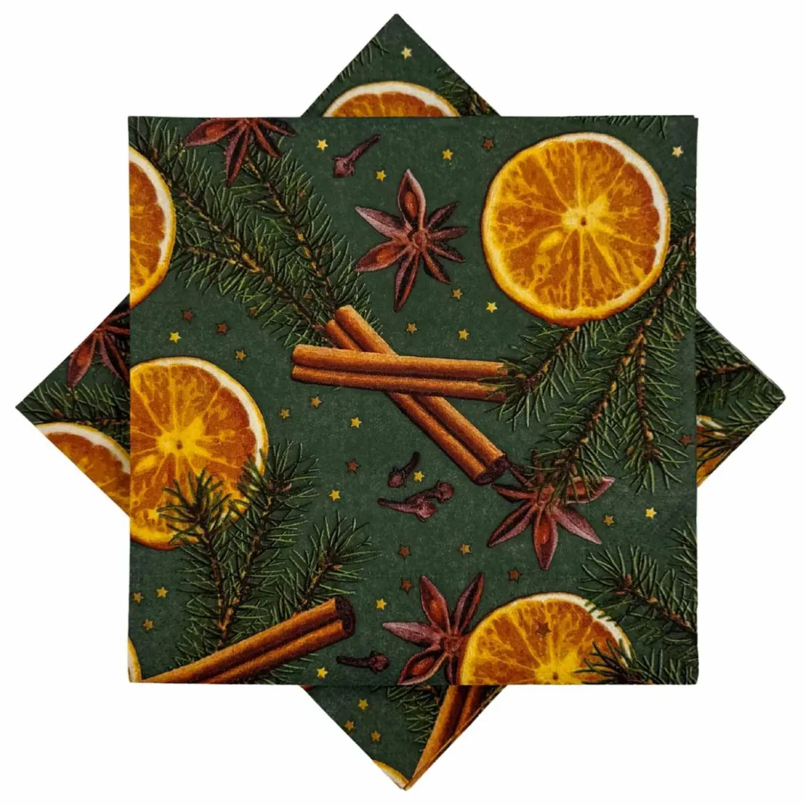 Serviett med varmgrønn bakgrunn og klassiske julekrydder som kanel, stjerneanis og tørket appelsin. En stemningsfull detalj til julemåltidet eller adventskaffen.