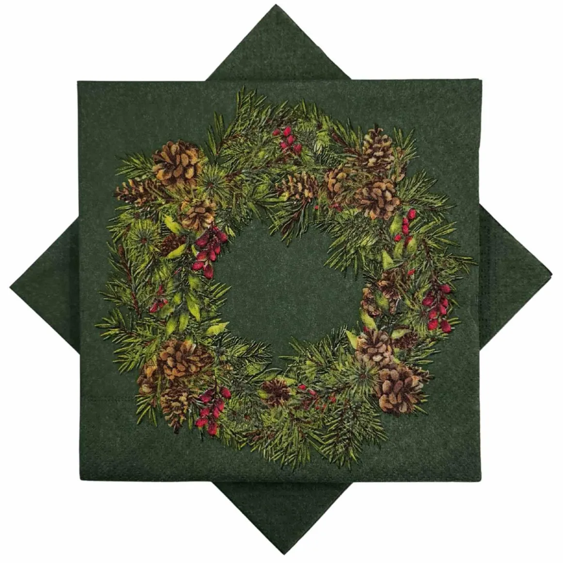 Grønn serviett med motiv av en frodig julekrans dekorert med kongler, grener og røde bær. Skaper en varm og tradisjonell stemning rundt julebordet.