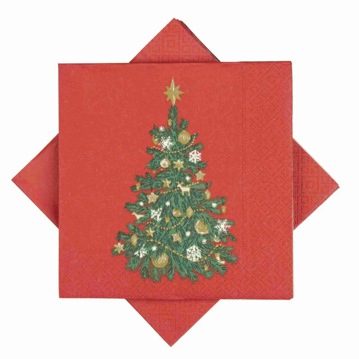 Koselig, rød juleserviett med juletremotiv. Fint til både hverdag og fest i jule- og adventstiden.