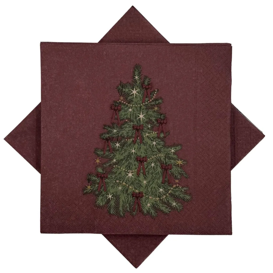 Papirserviett med dekorativt juletremotiv med burgunder bakrgunn. Skaper en lun og tradisjonsrik stemning rundt julebordet.