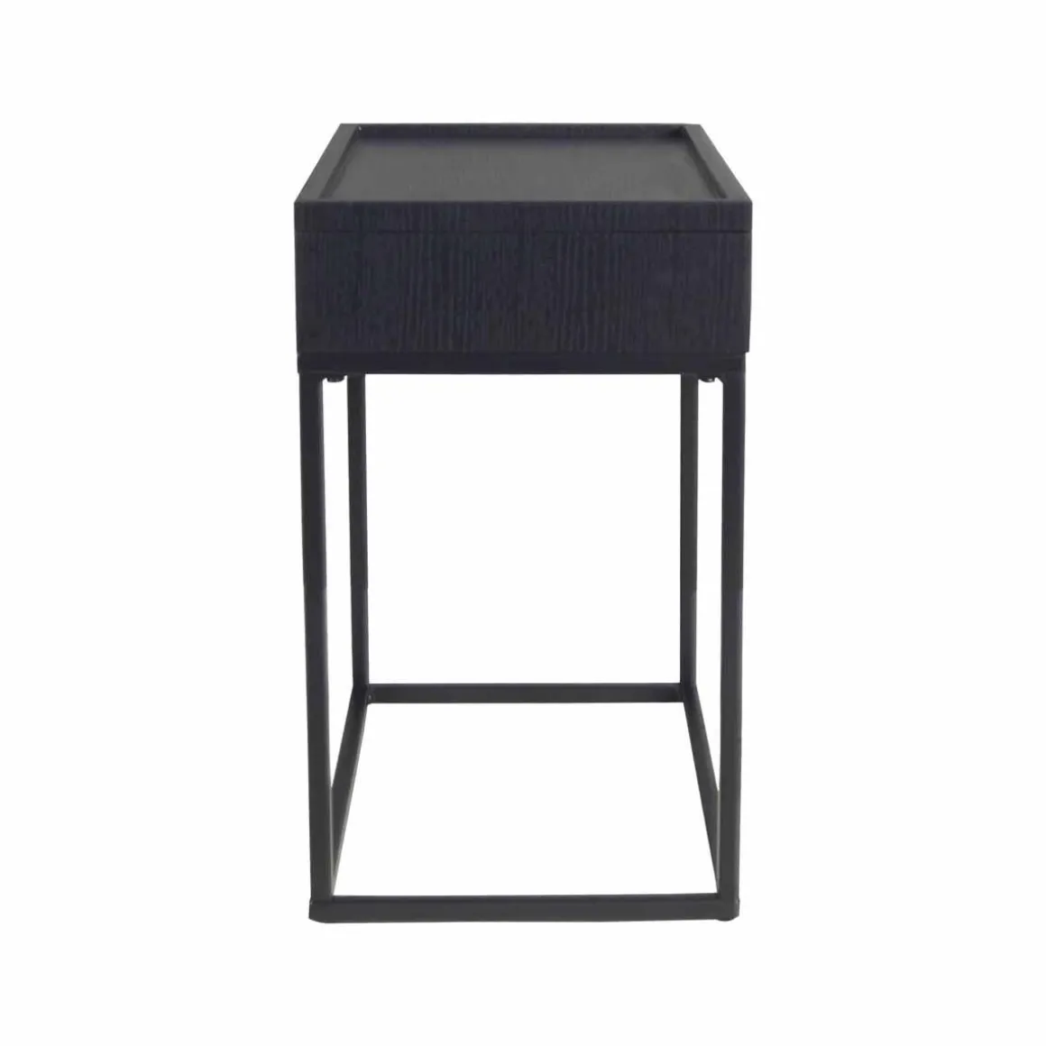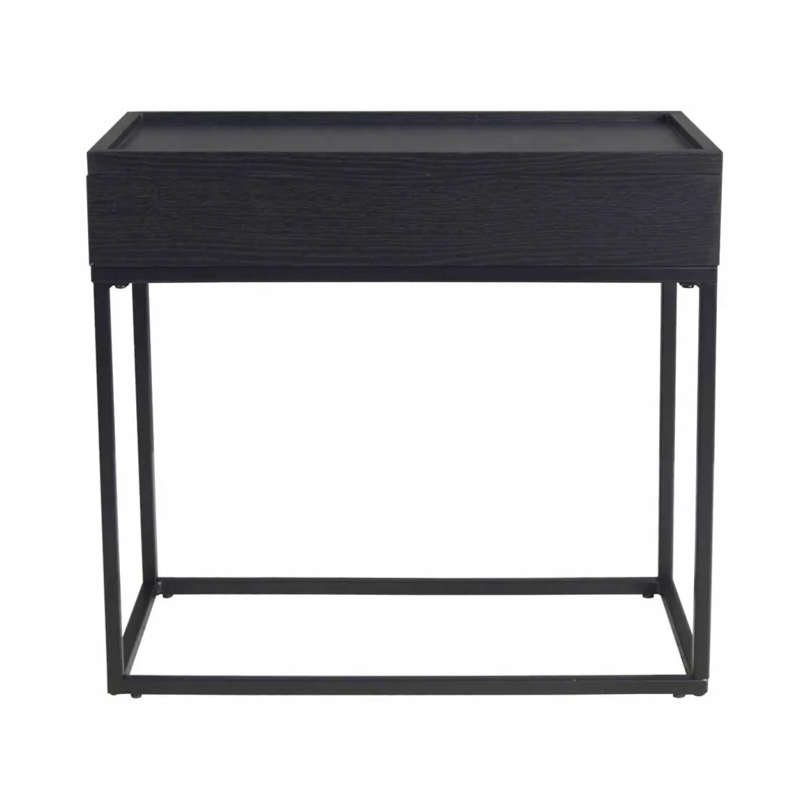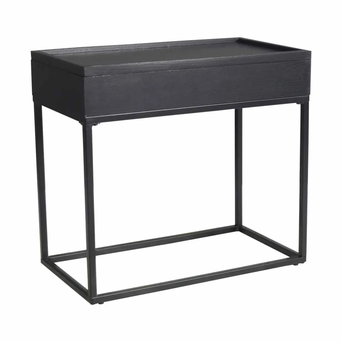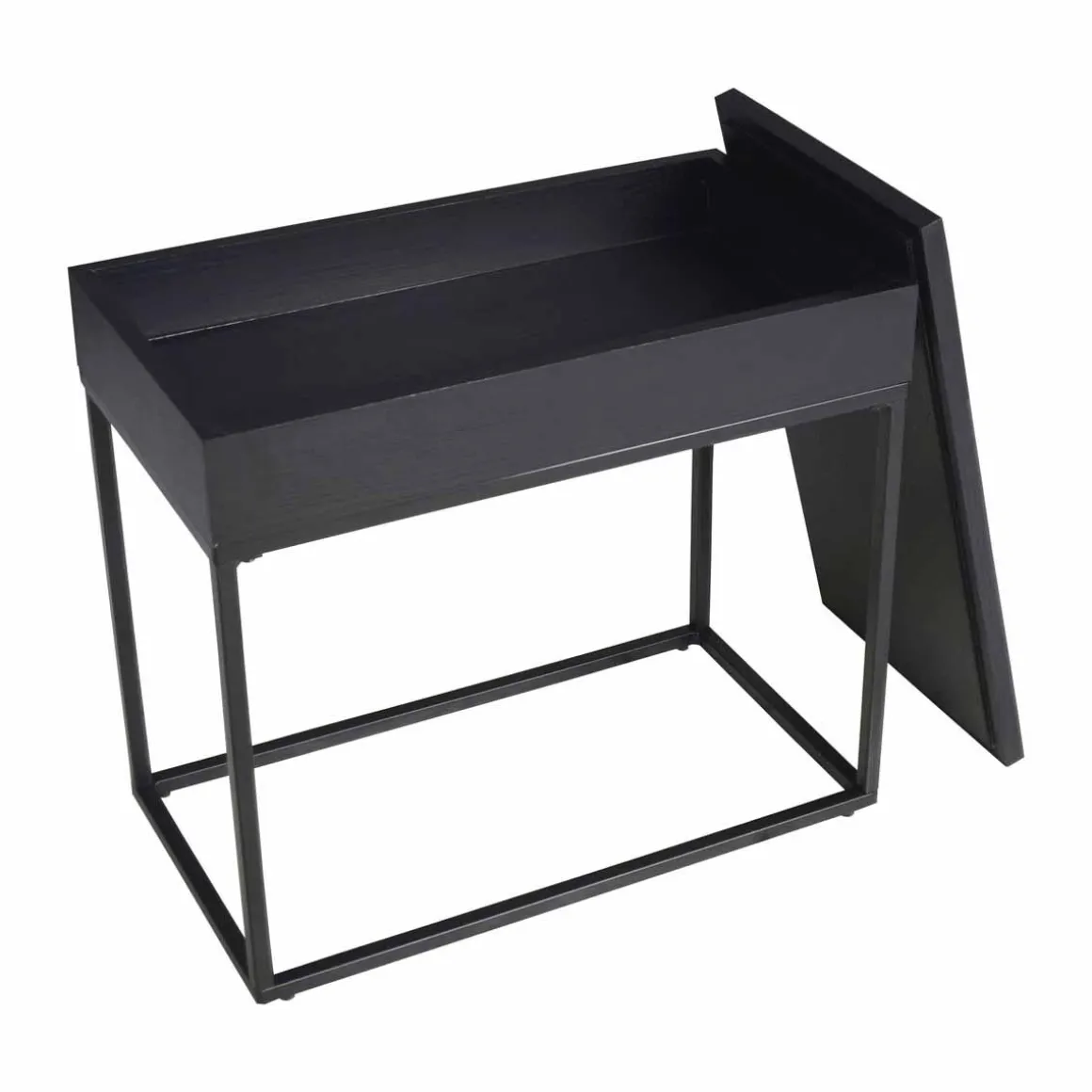 Et bord med smart oppbevaringsløsning. Topplokket kan løftes av for enkel oppbevaring av alt du ikke vil ha liggende fremme. Det svarte stativet i metall gir en fin kontrast og gjør det enkelt å kombinere med annet interiør.