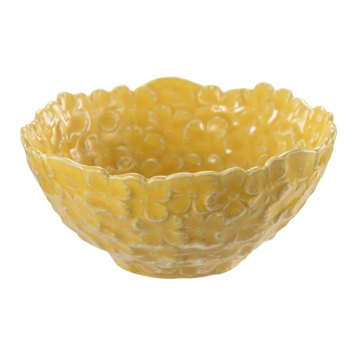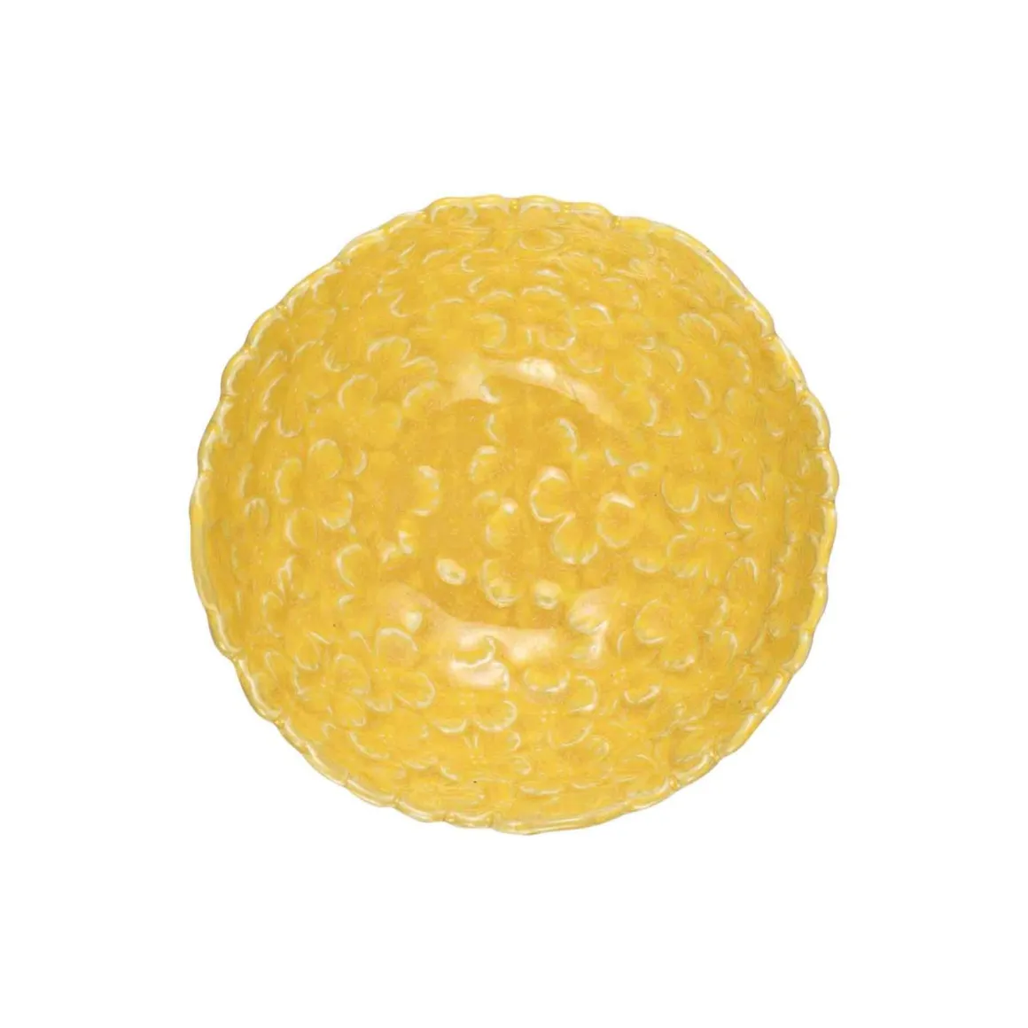 Dekorativ gul skål, med småblomstrete struktur. Fin som et ekstra tilskudd til serviser eller til frukt og bær.