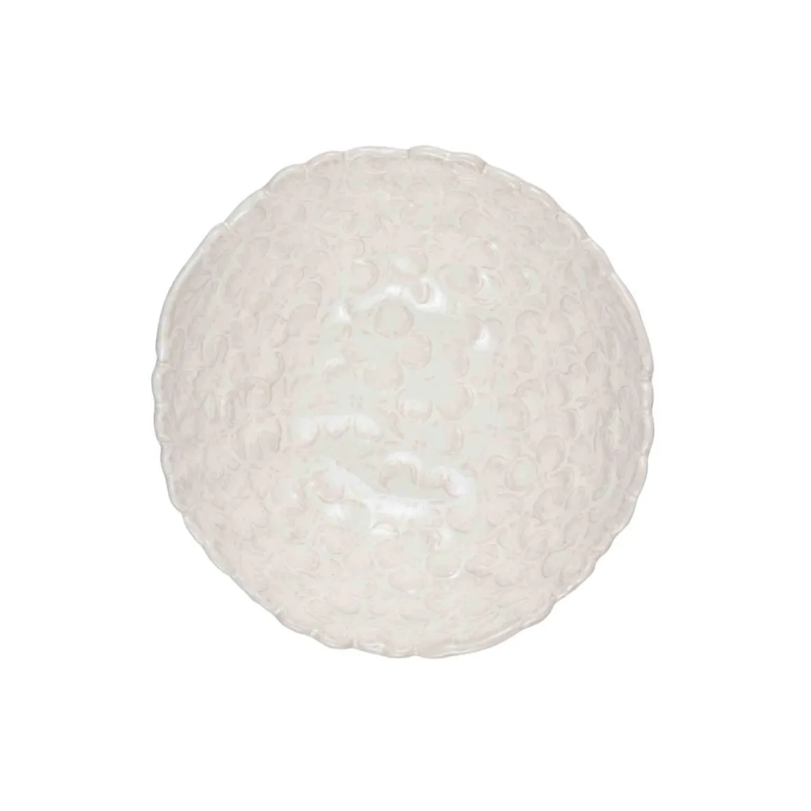 Nydelig hvit skål, med småblomstrete struktur. Fin som et ekstra tilskudd til serviser eller til frukt og bær.