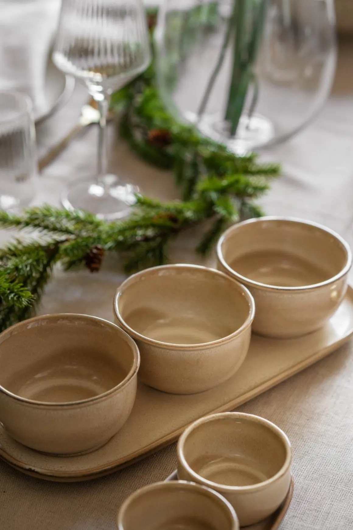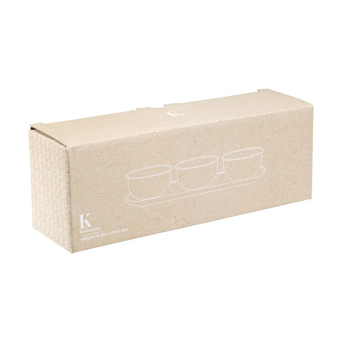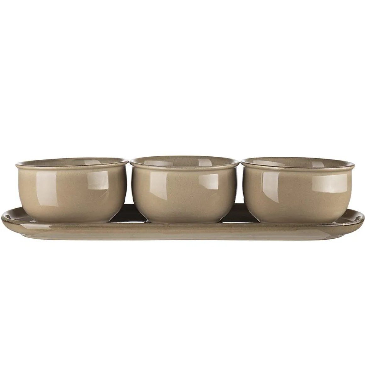 Lekkert serveringssett bestående av tre skåler i keramikk på et fat. Fin til tapas, snacks og taco, dipper og sauser. Fås også i