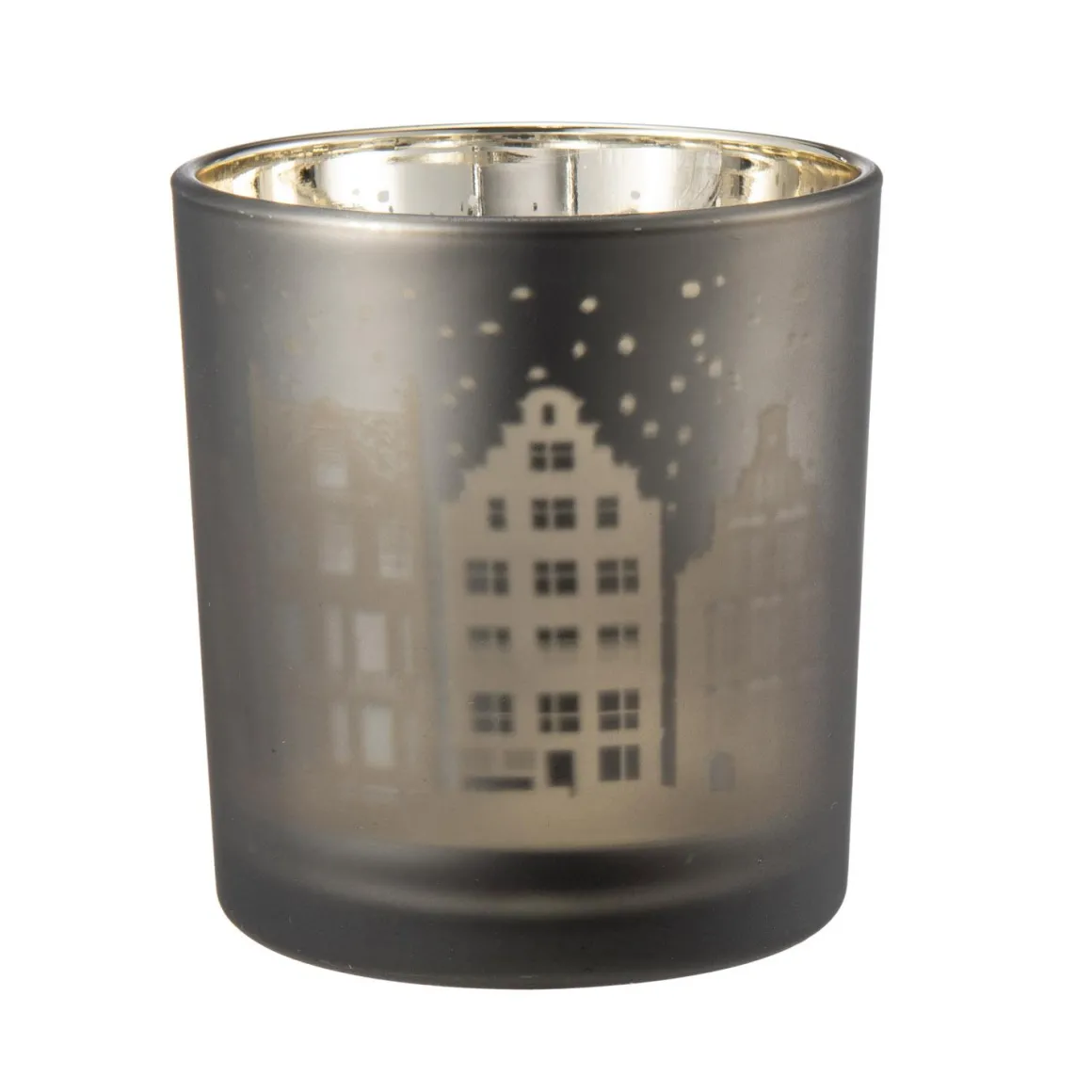 Det er noe helt spesielt med jul i byen. Fantastiske lys og god stemning! Ta med den fine julestemningen inn i hjemmet med den stilige telysholderen Amsterdam. Den har grå, matt finish på utsiden og blank innside som gjør at det fine by-motivet skinner ekstra godt. Telysholderen finnes i to størrelser og ser flotte ut sammen på et lysfat med annet dekor.