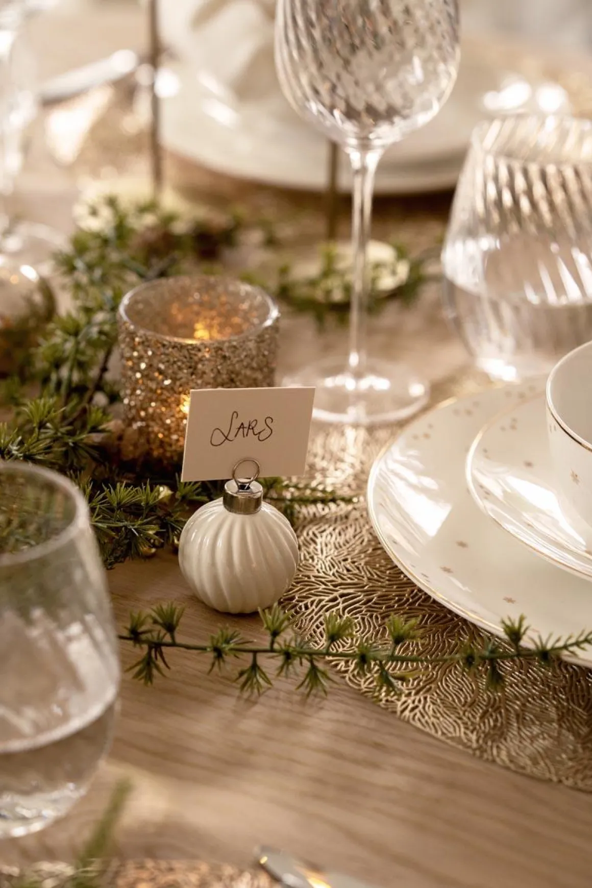 Gi julebordet et ekstra elegant preg med bordkortholdere formet som små julekuler. Perfekte til å markere plasser ved bordet eller som en dekorativ detalj. Kommer i pakke med fire stk.